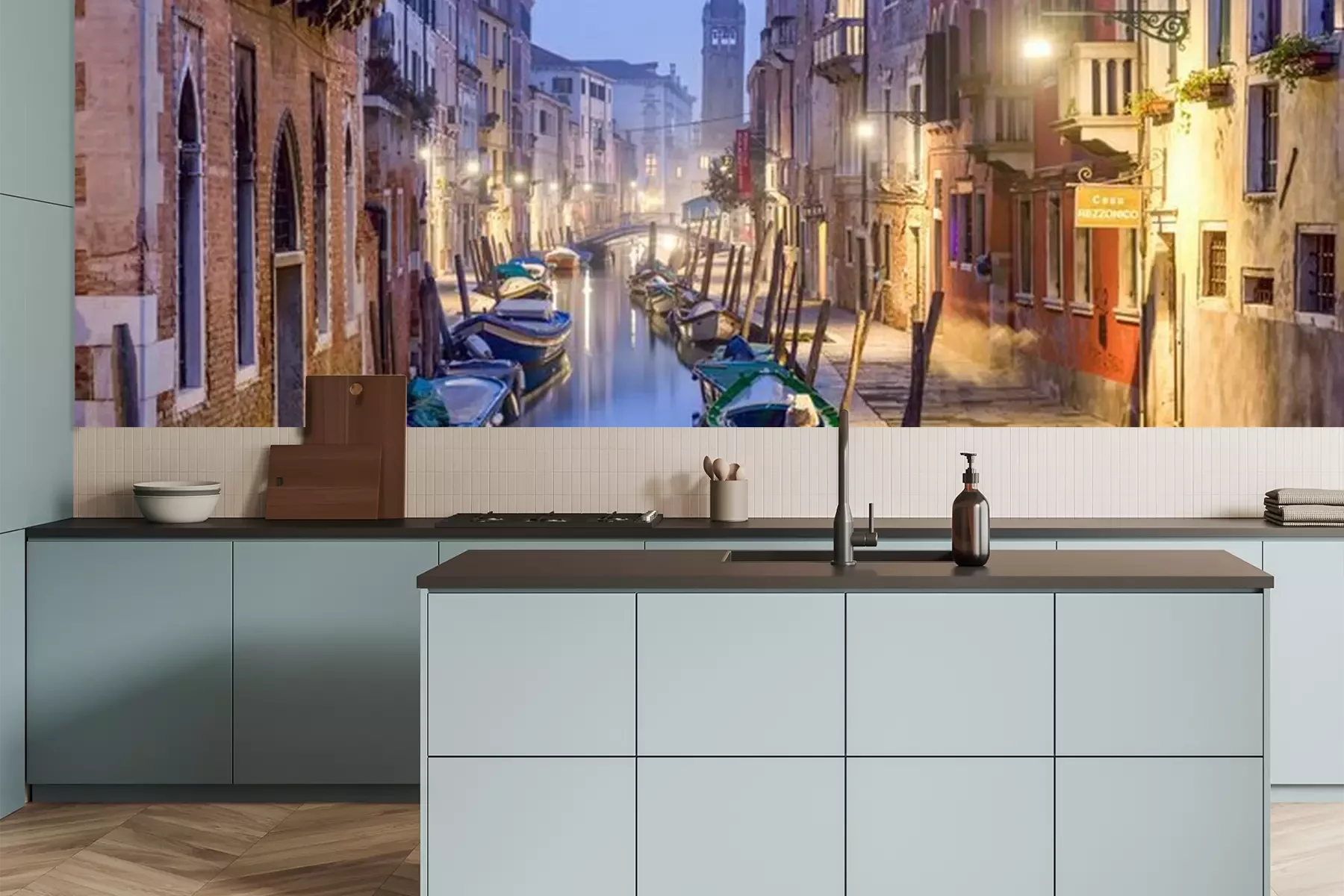 Het materiaal Premium is een glad vinyl op vlies, dat bestand is tegen uitrekken en vervorming. Het is dampdoorlatend – de muren kunnen vrij ademen – waardoor het geschikt is voor gebruik in de keuken en badkamer. Bij vervuiling kan het materiaal worden afgenomen met een vochtige doek. De maximale breedte van één baan bedraagt 95 of 105 cm, afhankelijk van de beschikbaarheid. Montage vindt plaats met de rand-aan-rand methode, wat een esthetisch resultaat zonder zichtbare naden oplevert. Omdat de lijm rechtstreeks op de muur wordt aangebracht, verloopt de installatie van het fotobehang snel en eenvoudig.