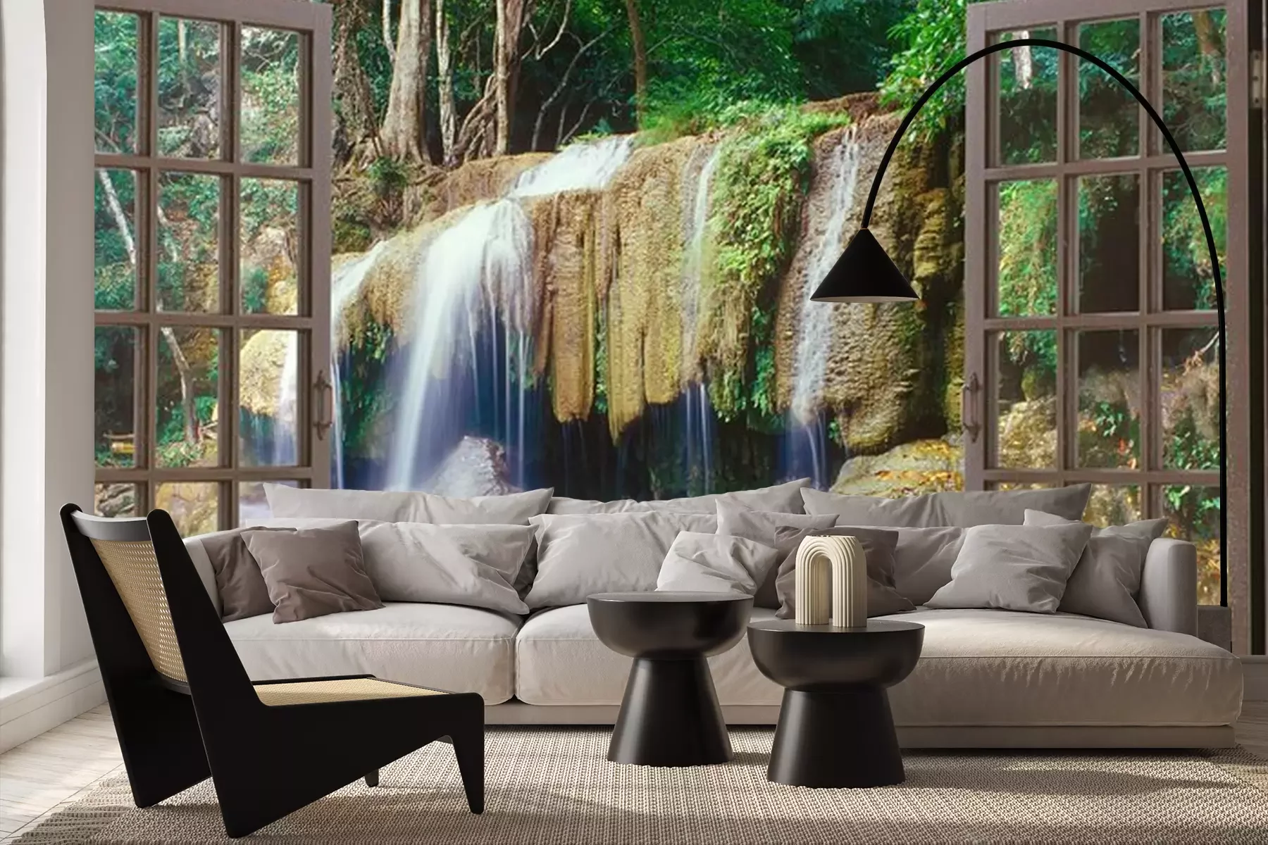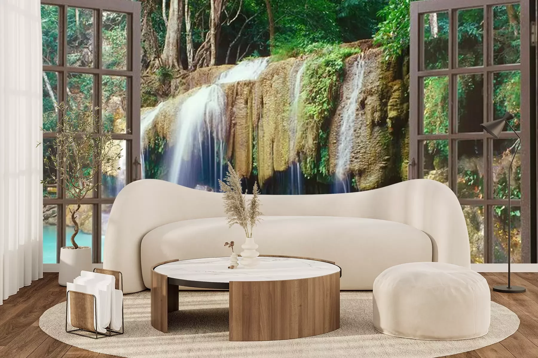 Een raam met uitzicht op een grote watervalFotobehang