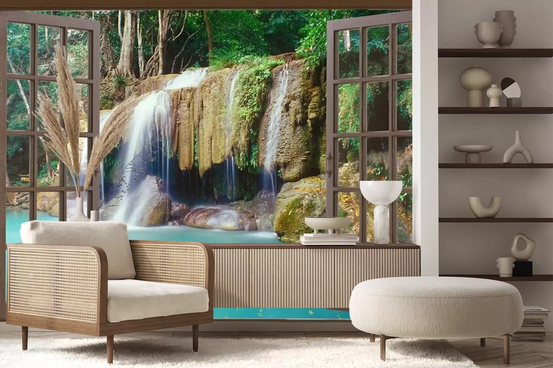 Uitzicht op de waterval vanuit een open raamFotobehang