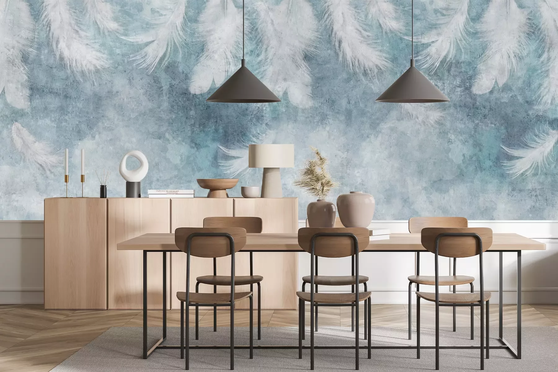 Het materiaal Premium+ is een gestructureerd vinyl op vlies met een gewicht van 255 g/m², dat kleine oneffenheden in de muur effectief camoufleert. De subtiele structuur van fijn zand geeft het oppervlak een exclusieve uitstraling, terwijl de halfmatte afwerking de diepte van de kleuren benadrukt. Het materiaal is dampdoorlatend, waardoor het ook in de keuken en badkamer kan worden gebruikt. De maximale breedte van één baan bedraagt 100 cm – bij grotere afmetingen wordt het fotobehang in meerdere gelijke banen verdeeld. De lijm wordt direct op de muur aangebracht en het behang wordt rand-aan-rand geplakt, wat zorgt voor een esthetisch resultaat zonder zichtbare naden. Het oppervlak kan gemakkelijk worden schoongemaakt door het voorzichtig af te nemen met een vochtige doek.