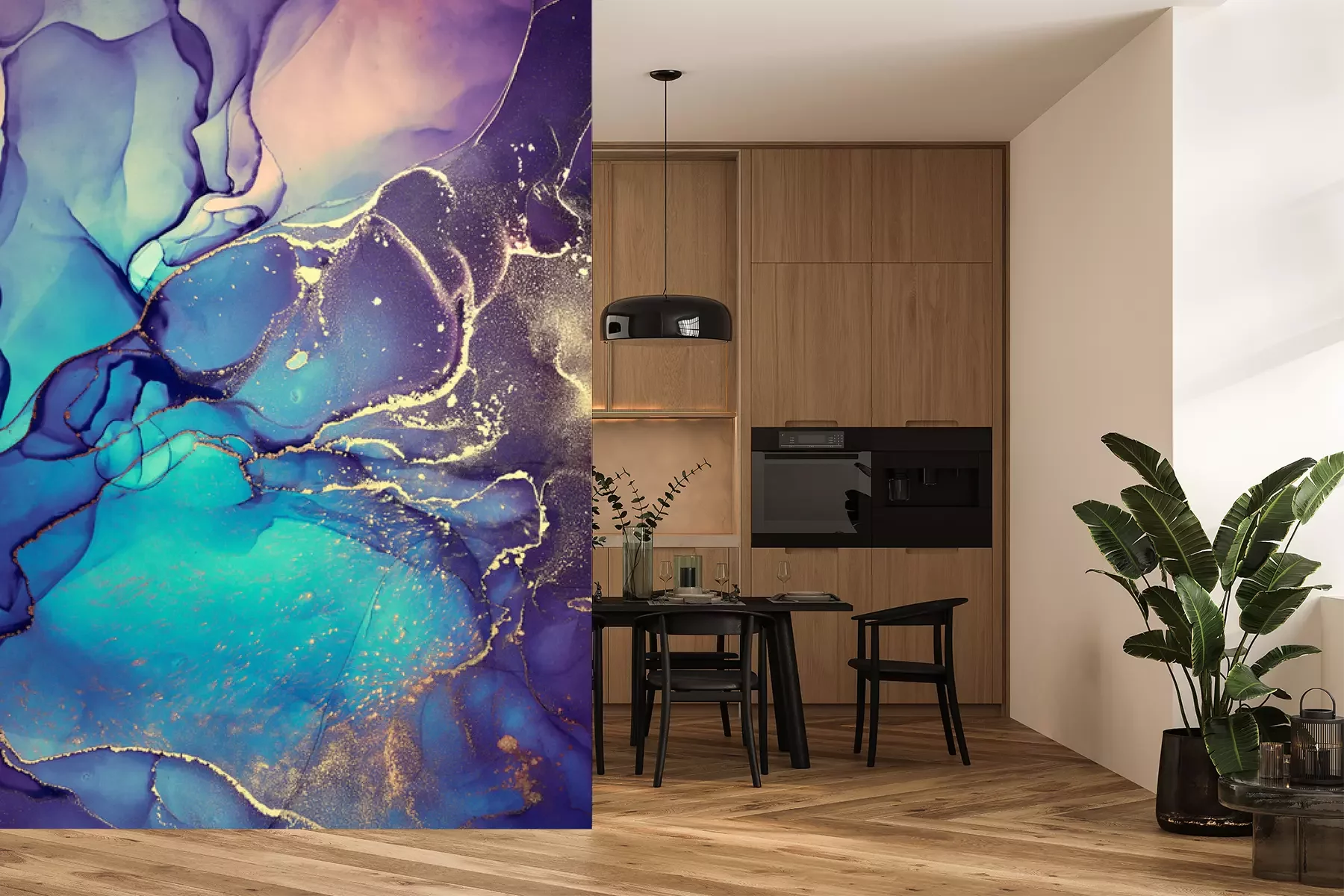 Het materiaal Premium+ is een gestructureerd vinyl op vlies met een gewicht van 255 g/m², dat kleine oneffenheden in de muur effectief camoufleert. De subtiele structuur van fijn zand geeft het oppervlak een exclusieve uitstraling, terwijl de halfmatte afwerking de diepte van de kleuren benadrukt. Het materiaal is dampdoorlatend, waardoor het ook in de keuken en badkamer kan worden gebruikt. De maximale breedte van één baan bedraagt 100 cm – bij grotere afmetingen wordt het fotobehang in meerdere gelijke banen verdeeld. De lijm wordt direct op de muur aangebracht en het behang wordt rand-aan-rand geplakt, wat zorgt voor een esthetisch resultaat zonder zichtbare naden. Het oppervlak kan gemakkelijk worden schoongemaakt door het voorzichtig af te nemen met een vochtige doek.