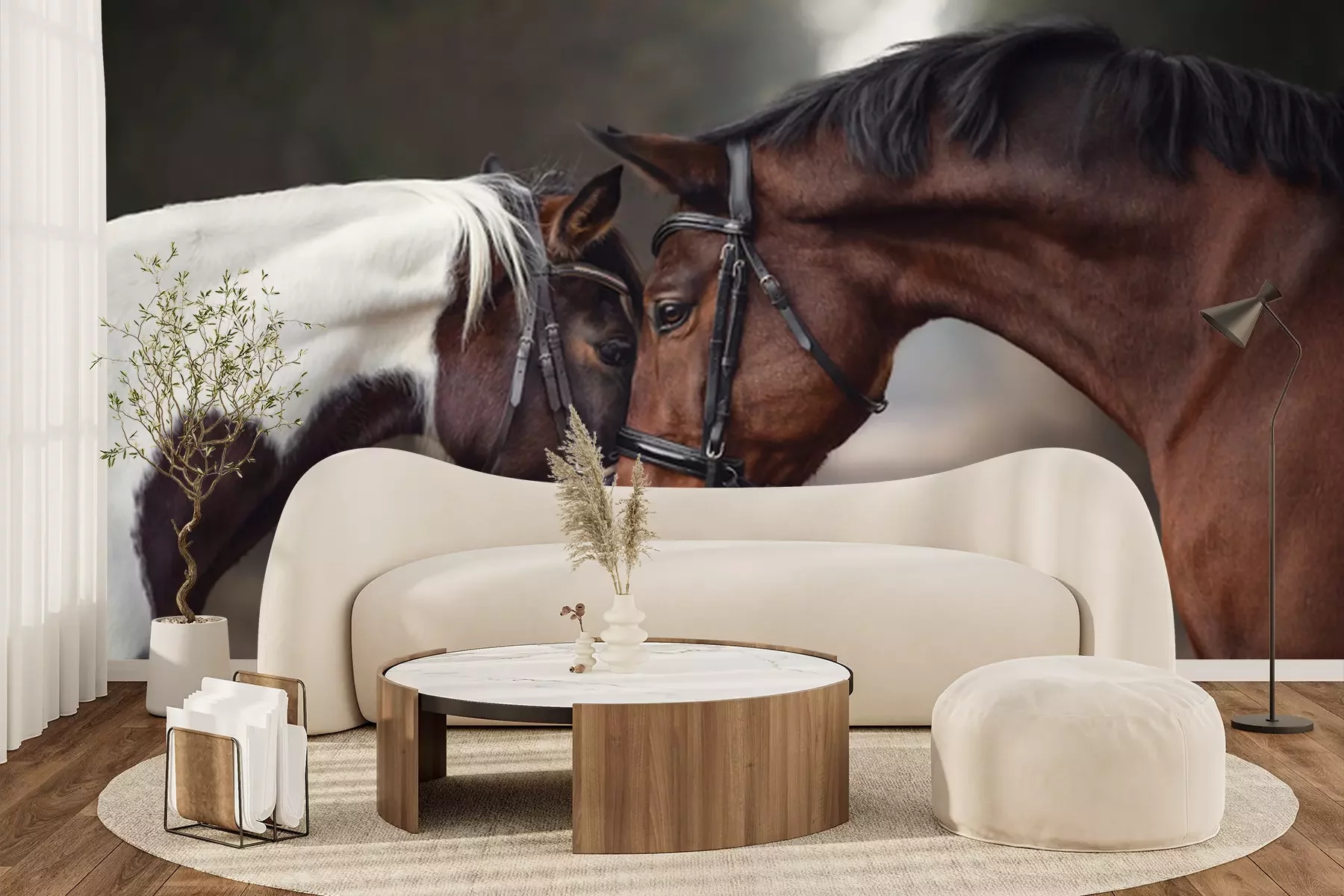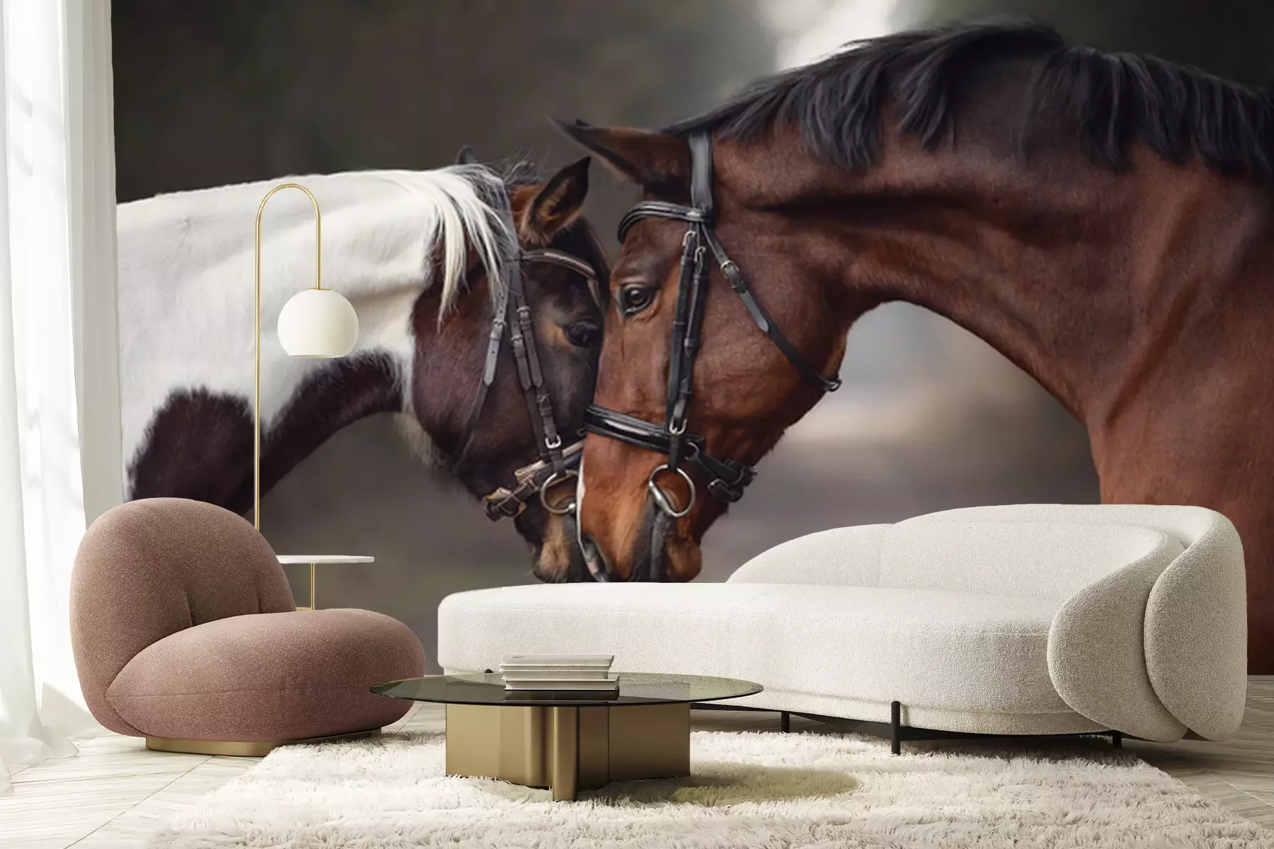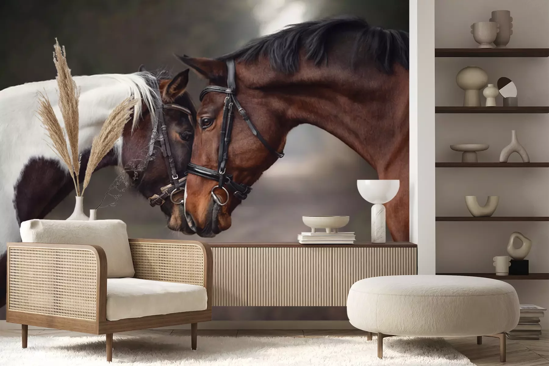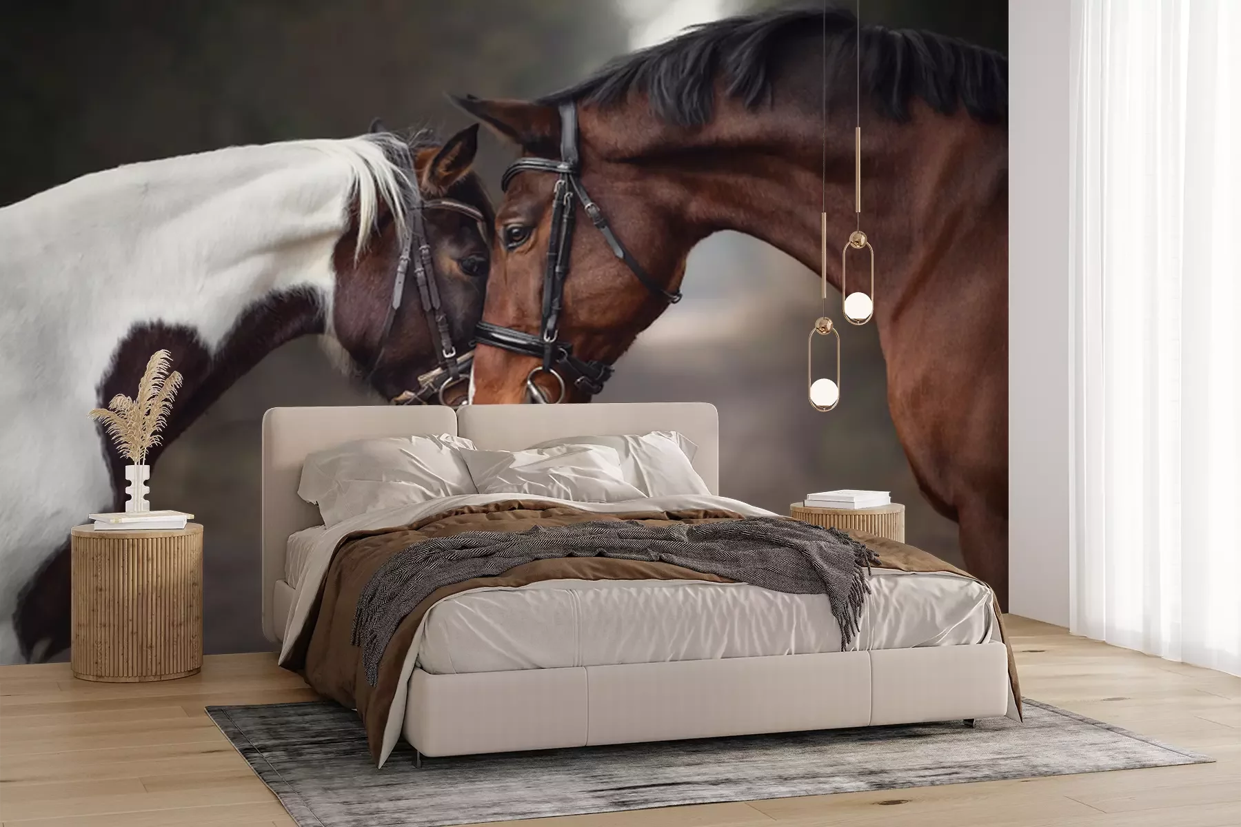 Fotobehang Verliefde paarden tegen de achtergrond van het bos