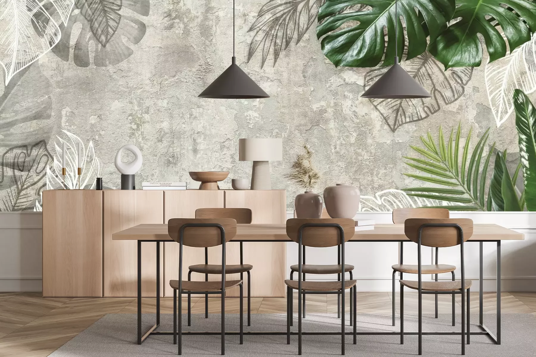 Tropische bladeren op grijs betonProbleemloze bezorging verzorgd door vertrouwde vervoerders