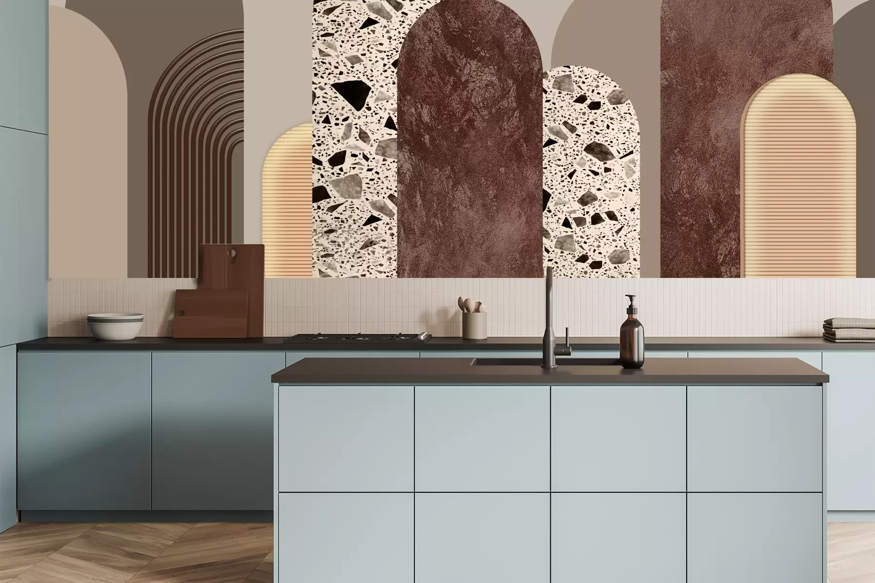 Het materiaal Premium is een glad vinyl op vlies, dat bestand is tegen uitrekken en vervorming. Het is dampdoorlatend – de muren kunnen vrij ademen – waardoor het geschikt is voor gebruik in de keuken en badkamer. Bij vervuiling kan het materiaal worden afgenomen met een vochtige doek. De maximale breedte van één baan bedraagt 95 of 105 cm, afhankelijk van de beschikbaarheid. Montage vindt plaats met de rand-aan-rand methode, wat een esthetisch resultaat zonder zichtbare naden oplevert. Omdat de lijm rechtstreeks op de muur wordt aangebracht, verloopt de installatie van het fotobehang snel en eenvoudig.