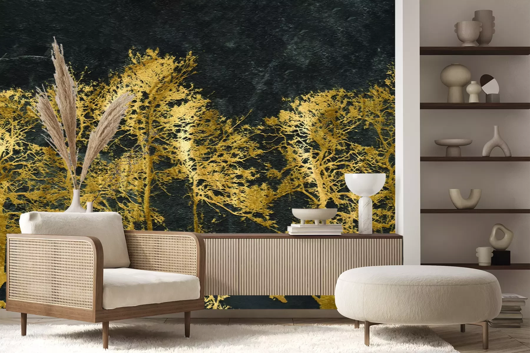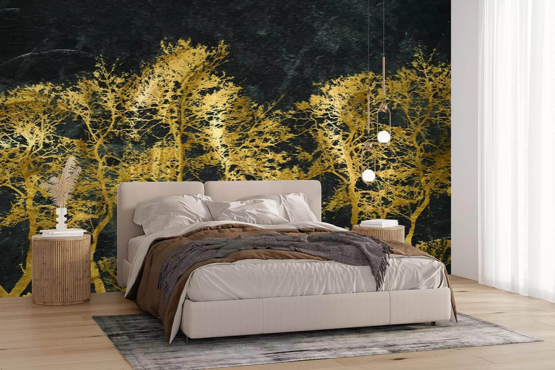 Het materiaal Premium+ is een gestructureerd vinyl op vlies met een gewicht van 255 g/m², dat kleine oneffenheden in de muur effectief camoufleert. De subtiele structuur van fijn zand geeft het oppervlak een exclusieve uitstraling, terwijl de halfmatte afwerking de diepte van de kleuren benadrukt. Het materiaal is dampdoorlatend, waardoor het ook in de keuken en badkamer kan worden gebruikt. De maximale breedte van één baan bedraagt 100 cm – bij grotere afmetingen wordt het fotobehang in meerdere gelijke banen verdeeld. De lijm wordt direct op de muur aangebracht en het behang wordt rand-aan-rand geplakt, wat zorgt voor een esthetisch resultaat zonder zichtbare naden. Het oppervlak kan gemakkelijk worden schoongemaakt door het voorzichtig af te nemen met een vochtige doek.