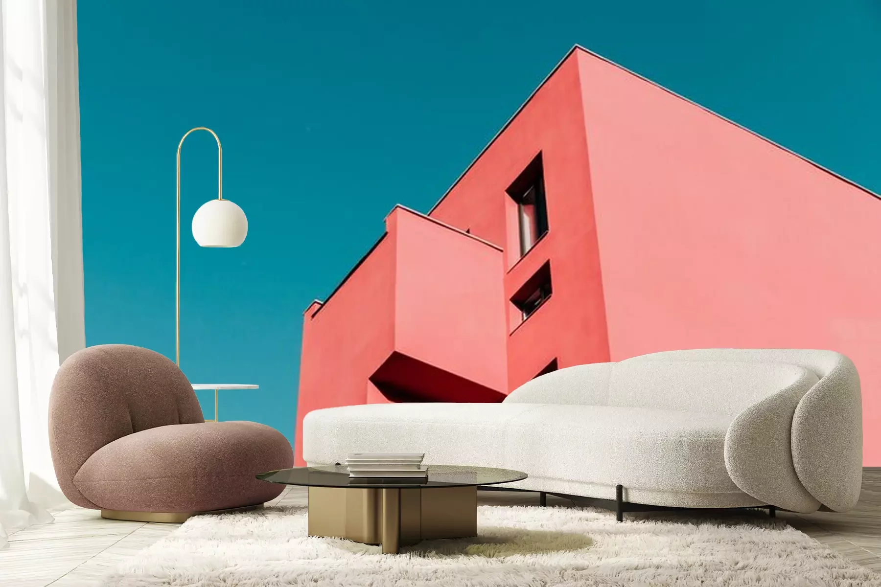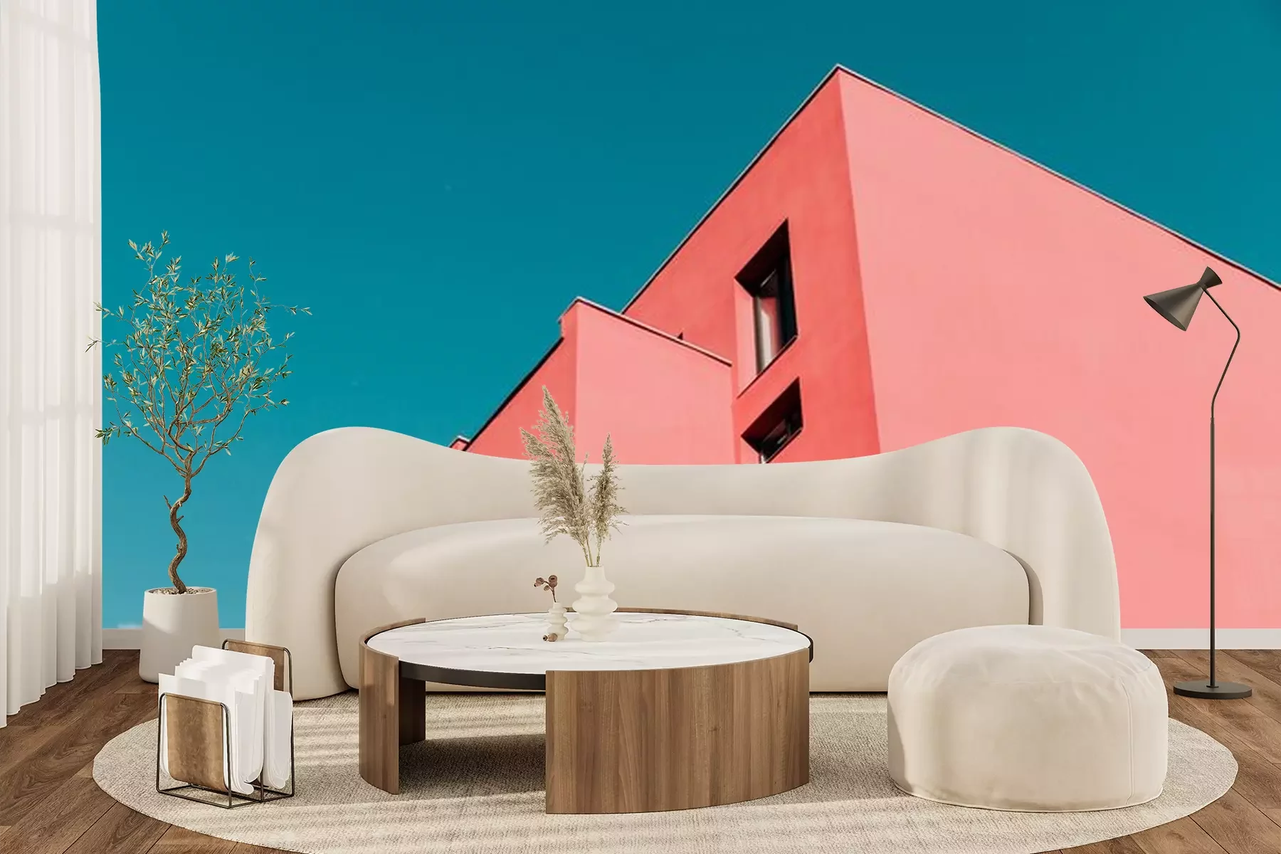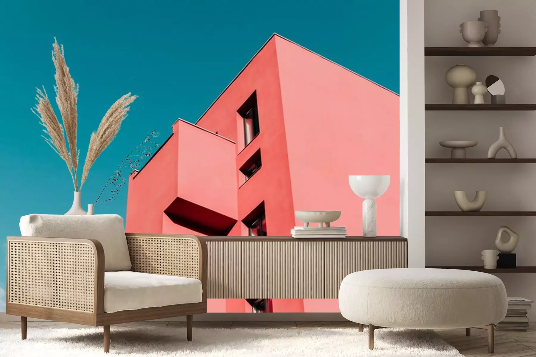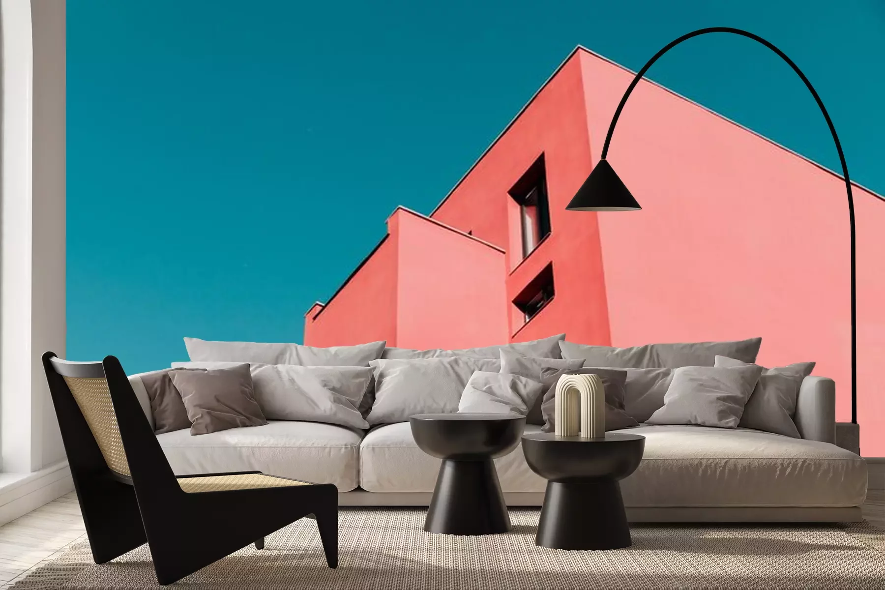 Fotobehang View from below on a pink modern house and sky. Vintage pastel colors, minimalist concept.