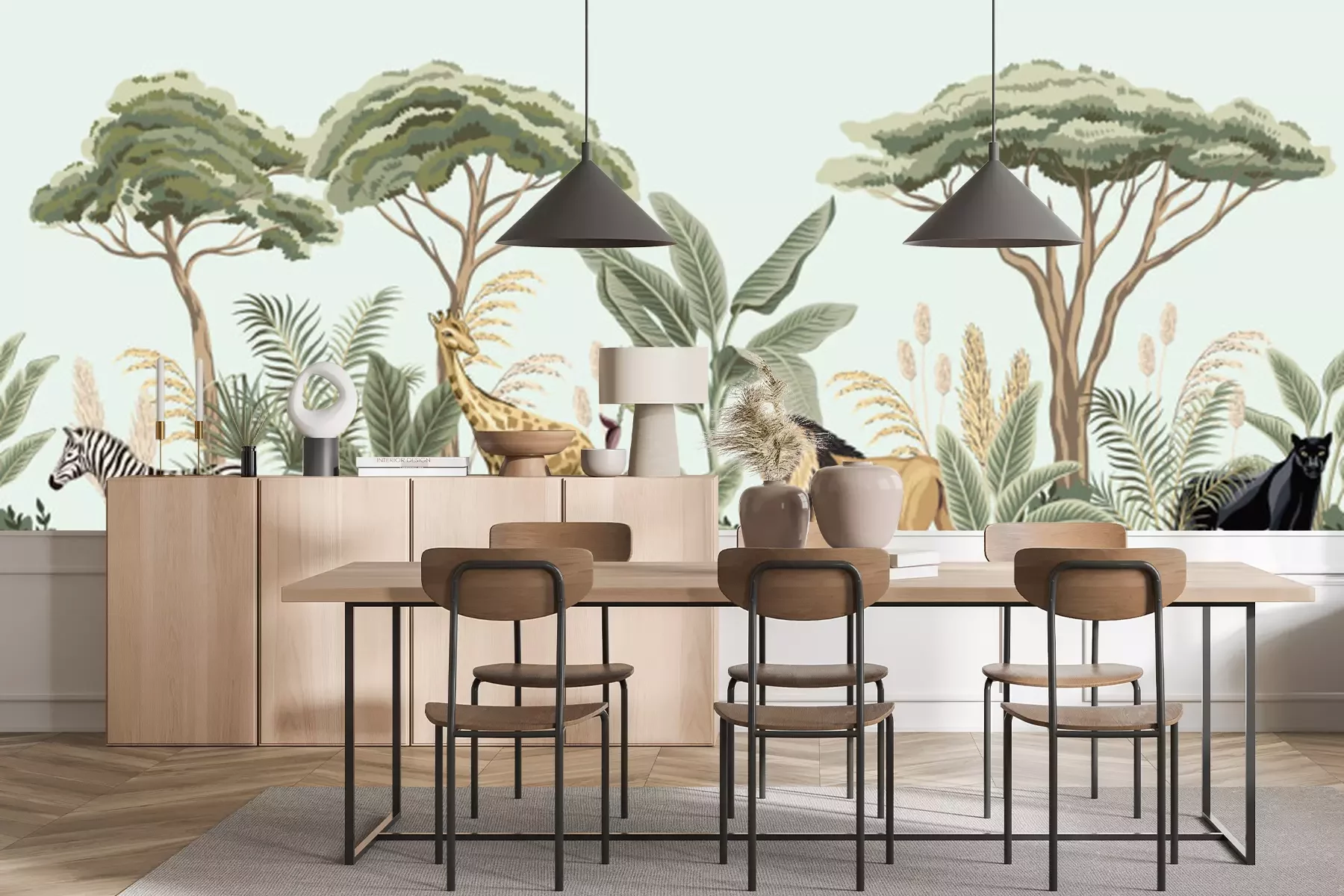 Fotobehang Vintage african tree, banana tree, plant, lion, giraffe, zebra, panther animal floral border blue background. Exotic safari wallpaper.