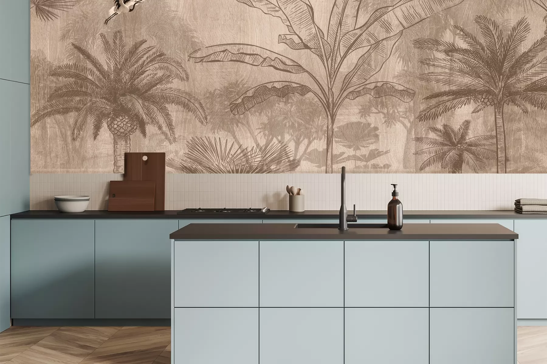 Het materiaal Premium is een glad vinyl op vlies, dat bestand is tegen uitrekken en vervorming. Het is dampdoorlatend – de muren kunnen vrij ademen – waardoor het geschikt is voor gebruik in de keuken en badkamer. Bij vervuiling kan het materiaal worden afgenomen met een vochtige doek. De maximale breedte van één baan bedraagt 95 of 105 cm, afhankelijk van de beschikbaarheid. Montage vindt plaats met de rand-aan-rand methode, wat een esthetisch resultaat zonder zichtbare naden oplevert. Omdat de lijm rechtstreeks op de muur wordt aangebracht, verloopt de installatie van het fotobehang snel en eenvoudig.