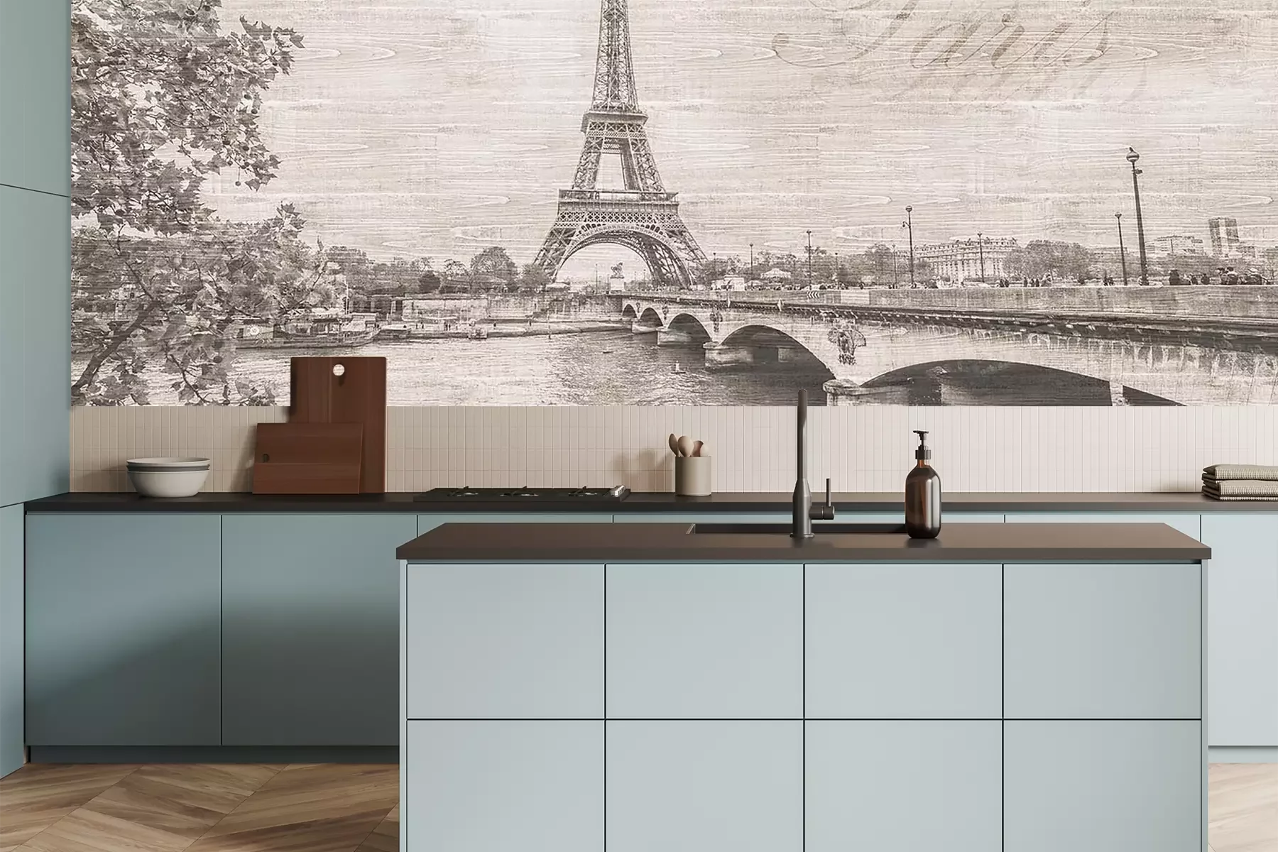 Het materiaal Premium is een glad vinyl op vlies, dat bestand is tegen uitrekken en vervorming. Het is dampdoorlatend – de muren kunnen vrij ademen – waardoor het geschikt is voor gebruik in de keuken en badkamer. Bij vervuiling kan het materiaal worden afgenomen met een vochtige doek. De maximale breedte van één baan bedraagt 95 of 105 cm, afhankelijk van de beschikbaarheid. Montage vindt plaats met de rand-aan-rand methode, wat een esthetisch resultaat zonder zichtbare naden oplevert. Omdat de lijm rechtstreeks op de muur wordt aangebracht, verloopt de installatie van het fotobehang snel en eenvoudig.