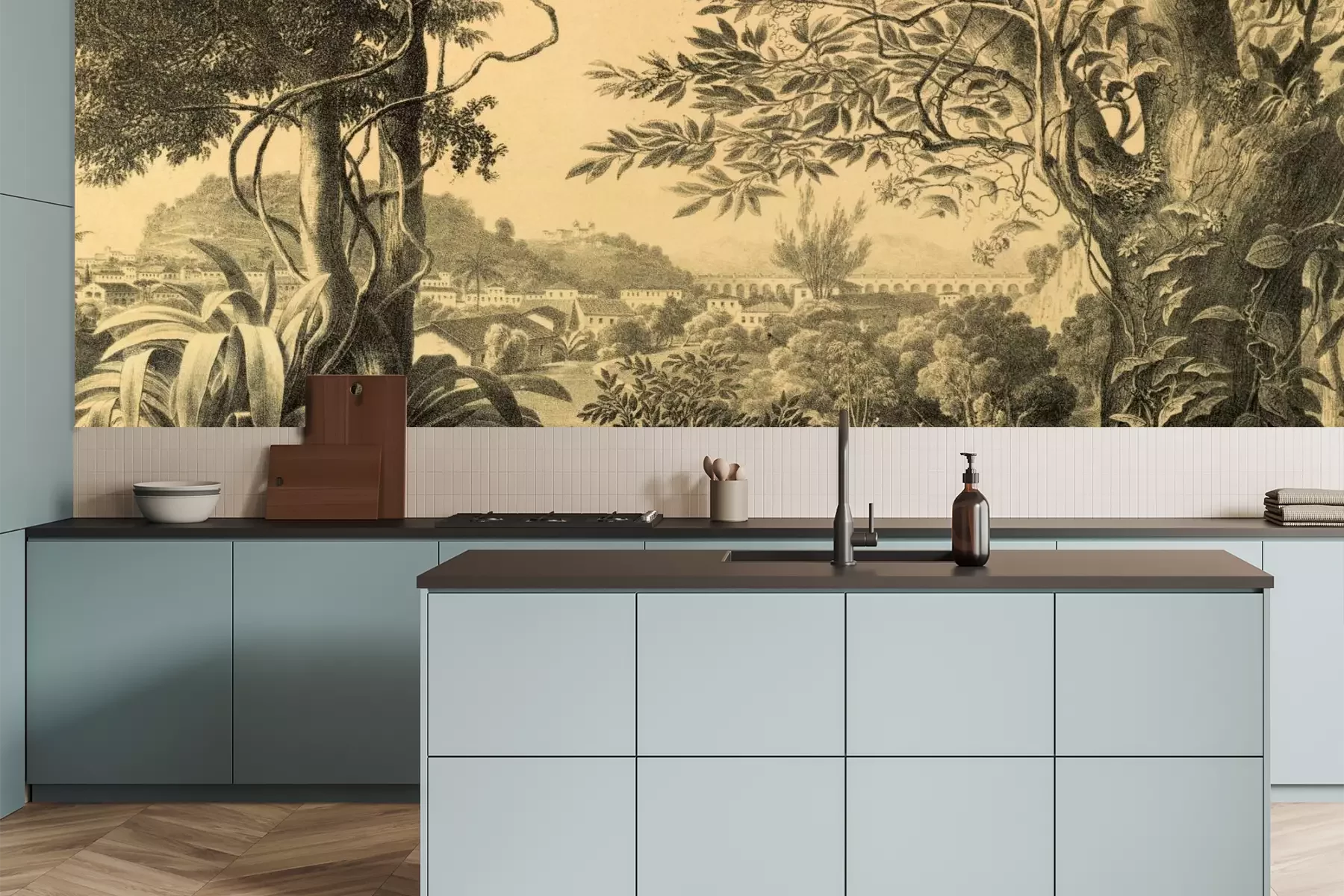 Het materiaal Premium is een glad vinyl op vlies, dat bestand is tegen uitrekken en vervorming. Het is dampdoorlatend – de muren kunnen vrij ademen – waardoor het geschikt is voor gebruik in de keuken en badkamer. Bij vervuiling kan het materiaal worden afgenomen met een vochtige doek. De maximale breedte van één baan bedraagt 95 of 105 cm, afhankelijk van de beschikbaarheid. Montage vindt plaats met de rand-aan-rand methode, wat een esthetisch resultaat zonder zichtbare naden oplevert. Omdat de lijm rechtstreeks op de muur wordt aangebracht, verloopt de installatie van het fotobehang snel en eenvoudig.
