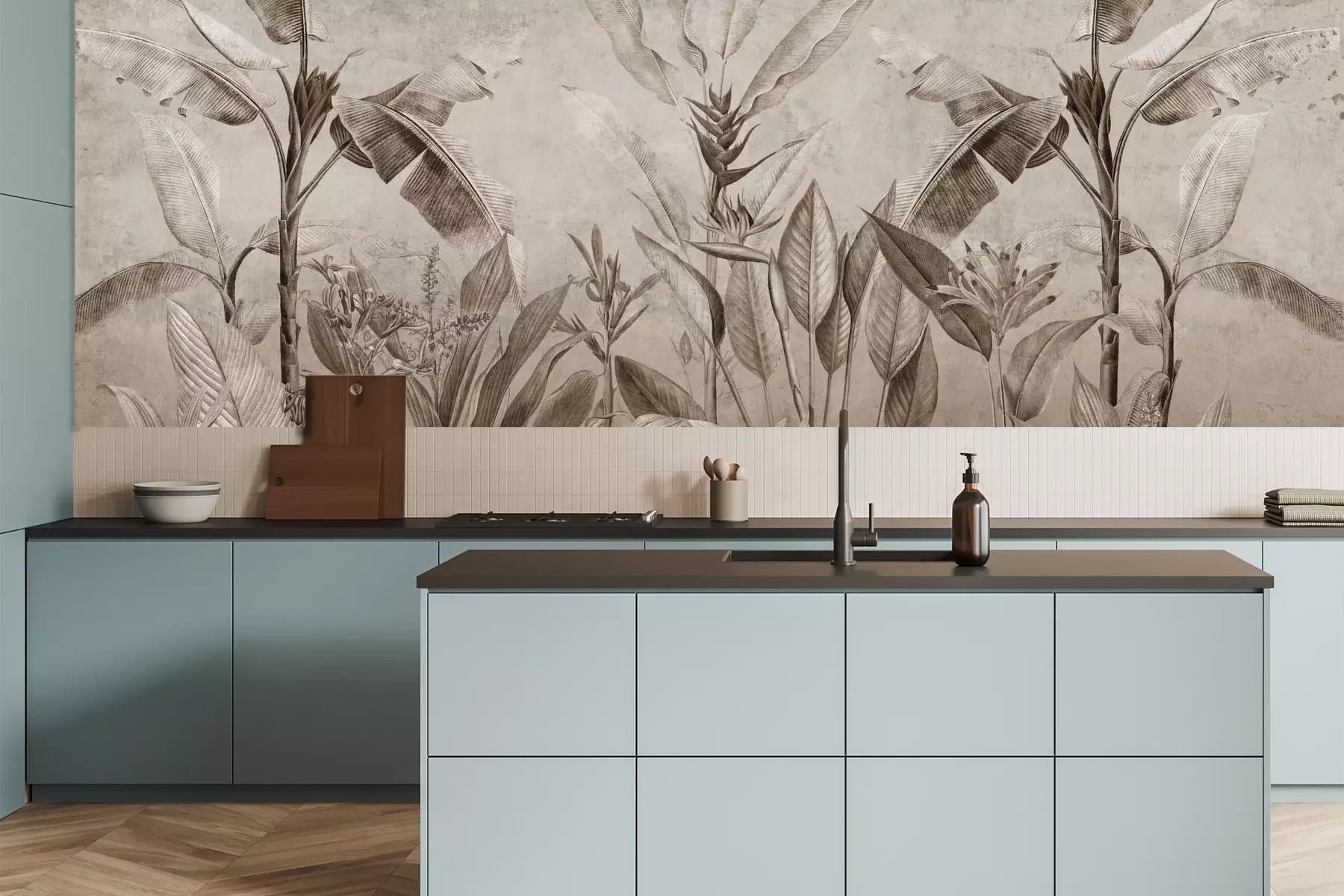 Het materiaal Premium is een glad vinyl op vlies, dat bestand is tegen uitrekken en vervorming. Het is dampdoorlatend – de muren kunnen vrij ademen – waardoor het geschikt is voor gebruik in de keuken en badkamer. Bij vervuiling kan het materiaal worden afgenomen met een vochtige doek. De maximale breedte van één baan bedraagt 95 of 105 cm, afhankelijk van de beschikbaarheid. Montage vindt plaats met de rand-aan-rand methode, wat een esthetisch resultaat zonder zichtbare naden oplevert. Omdat de lijm rechtstreeks op de muur wordt aangebracht, verloopt de installatie van het fotobehang snel en eenvoudig.