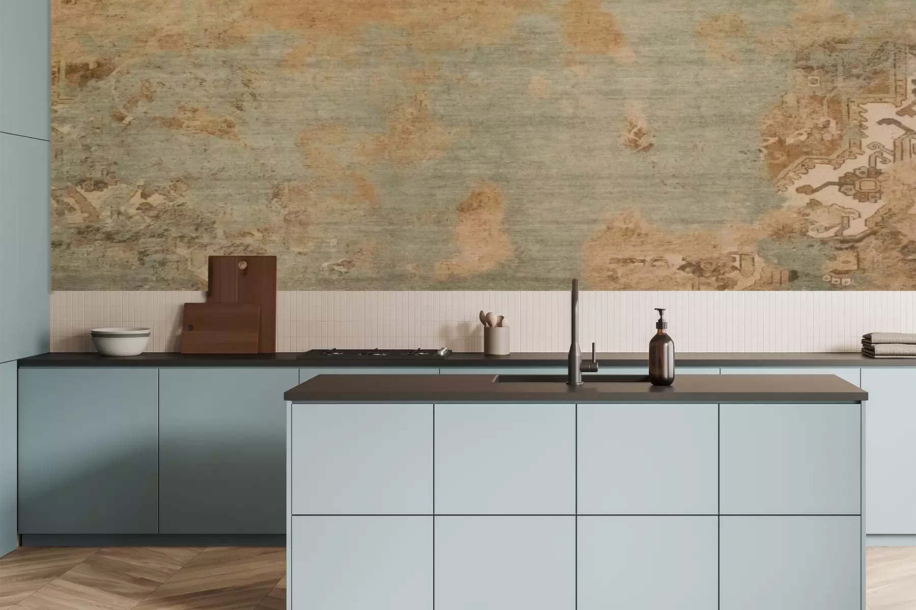 Het materiaal Premium is een glad vinyl op vlies, dat bestand is tegen uitrekken en vervorming. Het is dampdoorlatend – de muren kunnen vrij ademen – waardoor het geschikt is voor gebruik in de keuken en badkamer. Bij vervuiling kan het materiaal worden afgenomen met een vochtige doek. De maximale breedte van één baan bedraagt 95 of 105 cm, afhankelijk van de beschikbaarheid. Montage vindt plaats met de rand-aan-rand methode, wat een esthetisch resultaat zonder zichtbare naden oplevert. Omdat de lijm rechtstreeks op de muur wordt aangebracht, verloopt de installatie van het fotobehang snel en eenvoudig.