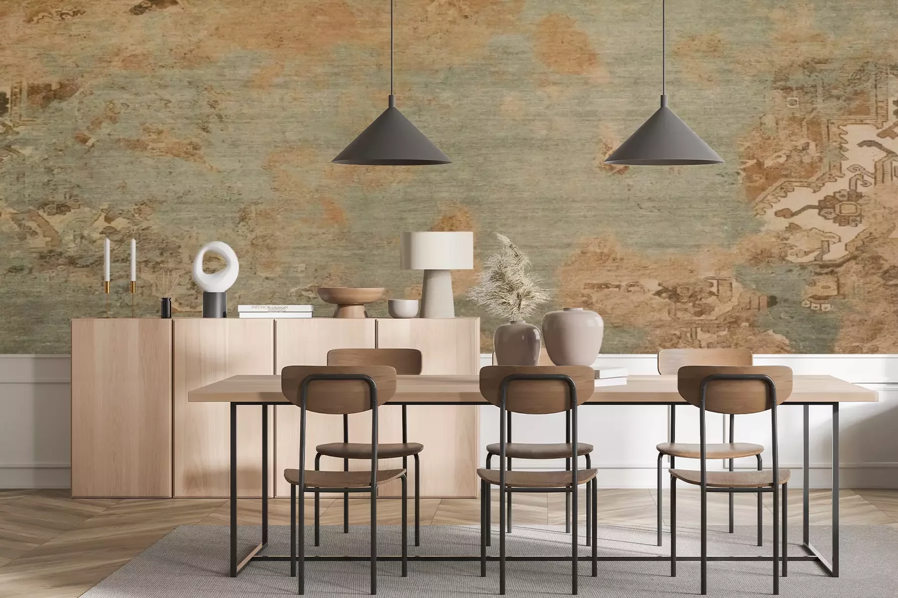 Het materiaal Standard is een hoogwaardig latexmateriaal met een glad, mat oppervlak. Dankzij de HP Latex-printtechnologie zijn de kleuren intens, duurzaam en UV-bestendig, waardoor het patroon jarenlang een onberispelijke uitstraling behoudt. Vervuilde oppervlakken kunnen voorzichtig worden afgeveegd met een droge doek. De maximale breedte van één baan bedraagt 95 cm of 105 cm – afhankelijk van de bestelde fotobehangbreedte. Bij grotere afmetingen wordt het patroon verdeeld over meerdere gelijkmatige banen. Het fotobehang wordt rand-aan-randaangebracht, wat vrijwel onzichtbare naden mogelijk maakt.