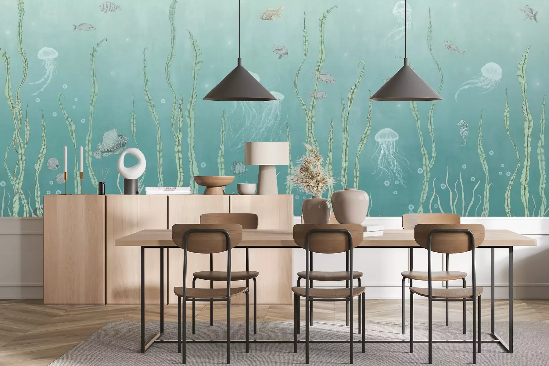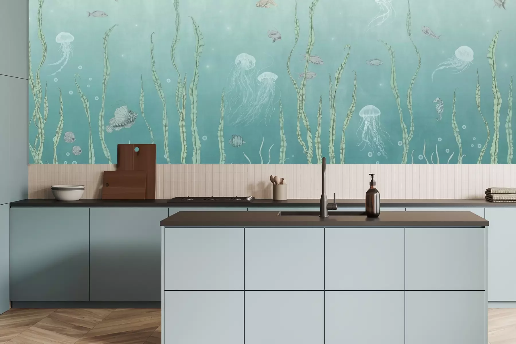Vissen en kwallen tussen groene planten in een onderwaterlandschap