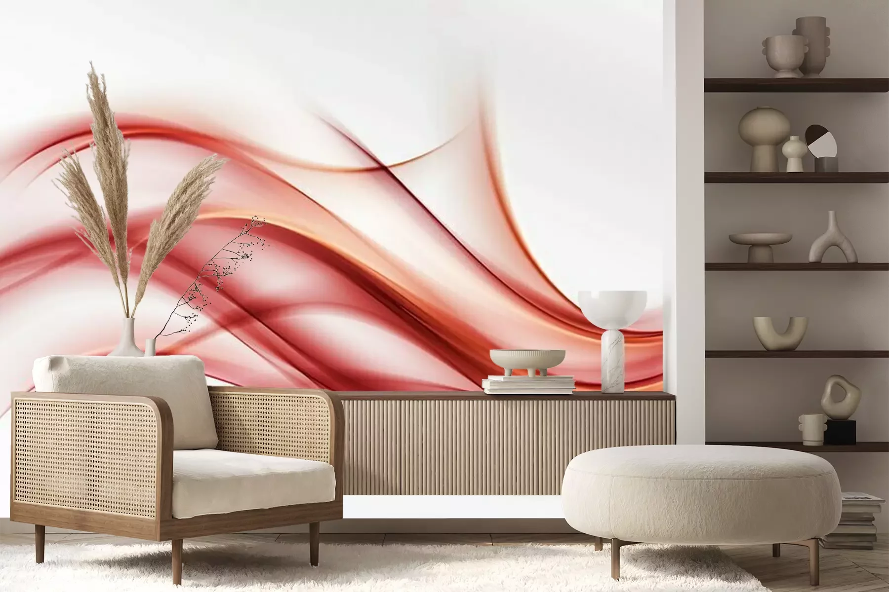 Het materiaal Premium+ is een gestructureerd vinyl op vlies met een gewicht van 255 g/m², dat kleine oneffenheden in de muur effectief camoufleert. De subtiele structuur van fijn zand geeft het oppervlak een exclusieve uitstraling, terwijl de halfmatte afwerking de diepte van de kleuren benadrukt. Het materiaal is dampdoorlatend, waardoor het ook in de keuken en badkamer kan worden gebruikt. De maximale breedte van één baan bedraagt 100 cm – bij grotere afmetingen wordt het fotobehang in meerdere gelijke banen verdeeld. De lijm wordt direct op de muur aangebracht en het behang wordt rand-aan-rand geplakt, wat zorgt voor een esthetisch resultaat zonder zichtbare naden. Het oppervlak kan gemakkelijk worden schoongemaakt door het voorzichtig af te nemen met een vochtige doek.