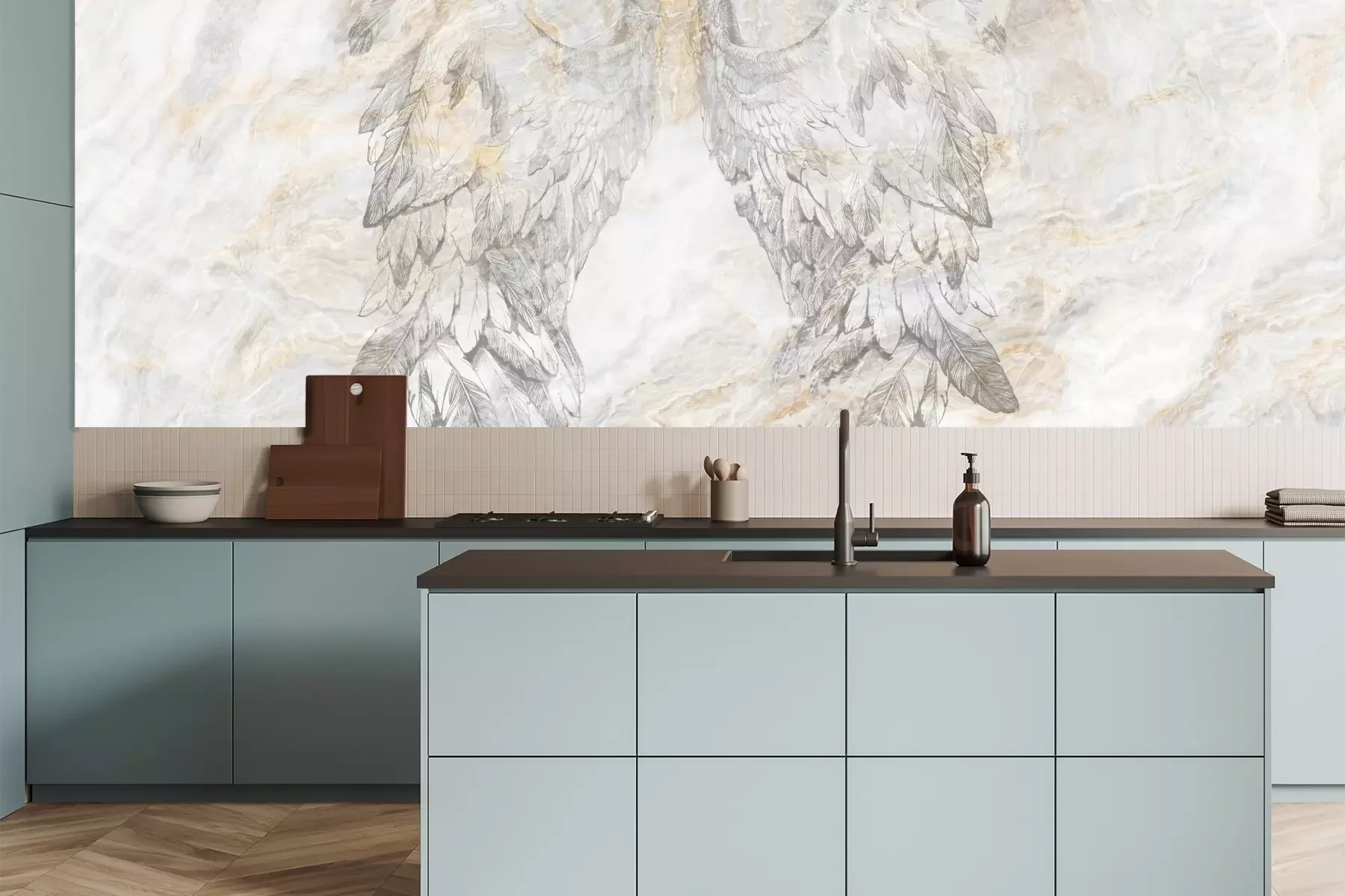 Het materiaal Premium is een glad vinyl op vlies, dat bestand is tegen uitrekken en vervorming. Het is dampdoorlatend – de muren kunnen vrij ademen – waardoor het geschikt is voor gebruik in de keuken en badkamer. Bij vervuiling kan het materiaal worden afgenomen met een vochtige doek. De maximale breedte van één baan bedraagt 95 of 105 cm, afhankelijk van de beschikbaarheid. Montage vindt plaats met de rand-aan-rand methode, wat een esthetisch resultaat zonder zichtbare naden oplevert. Omdat de lijm rechtstreeks op de muur wordt aangebracht, verloopt de installatie van het fotobehang snel en eenvoudig.