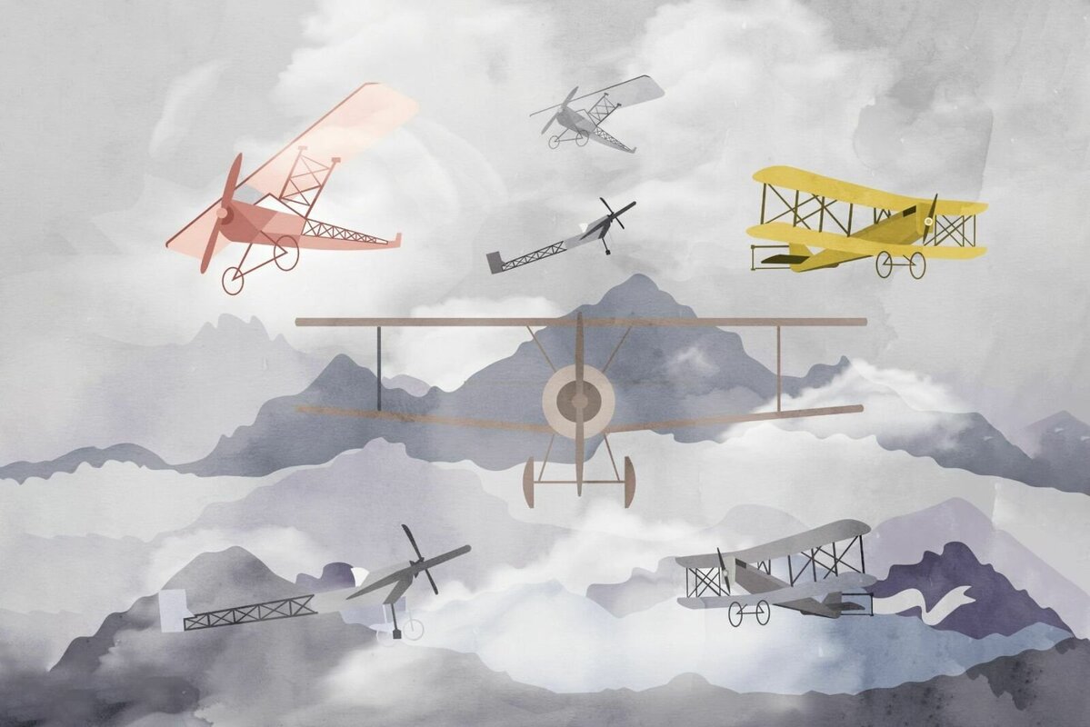 Fotobehang: Vliegtuigen in een bergachtig aquarellandschap