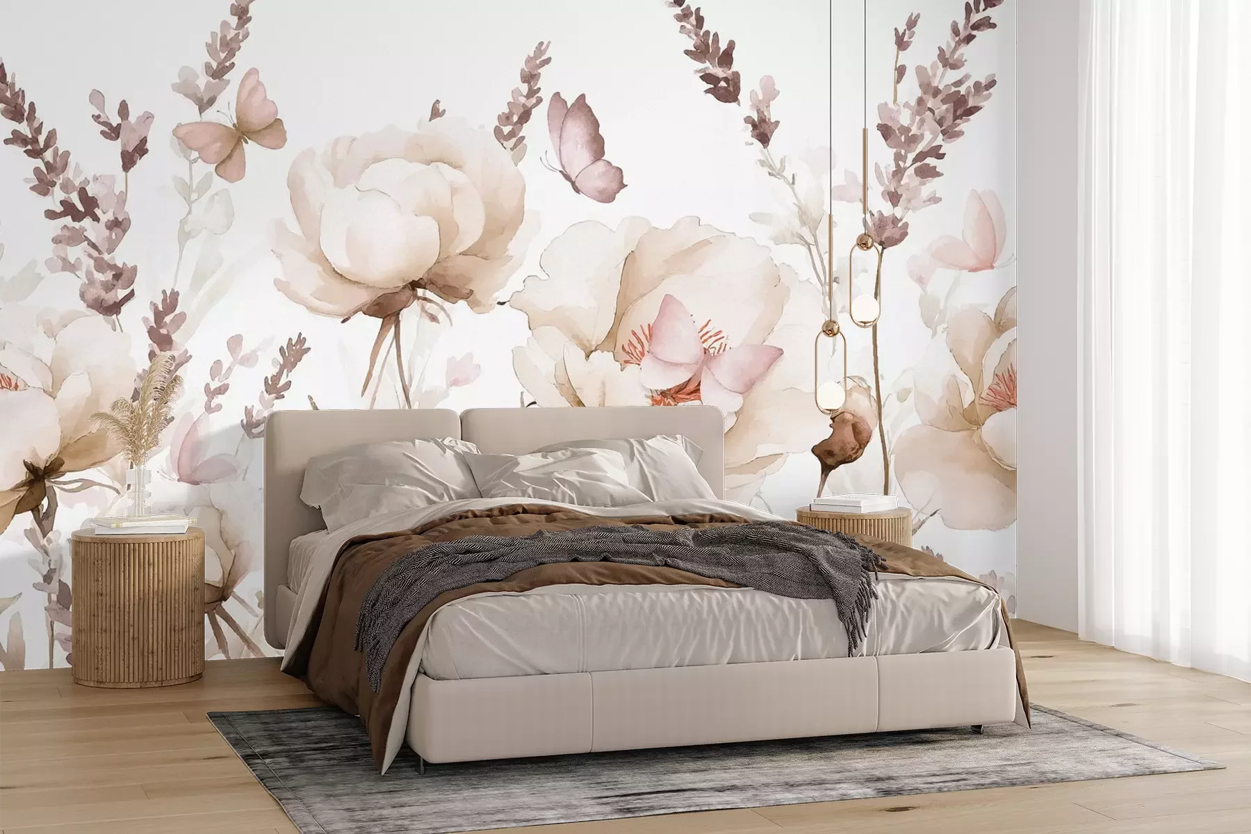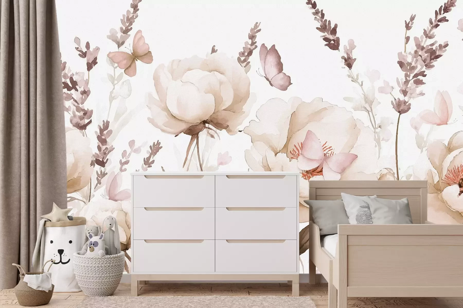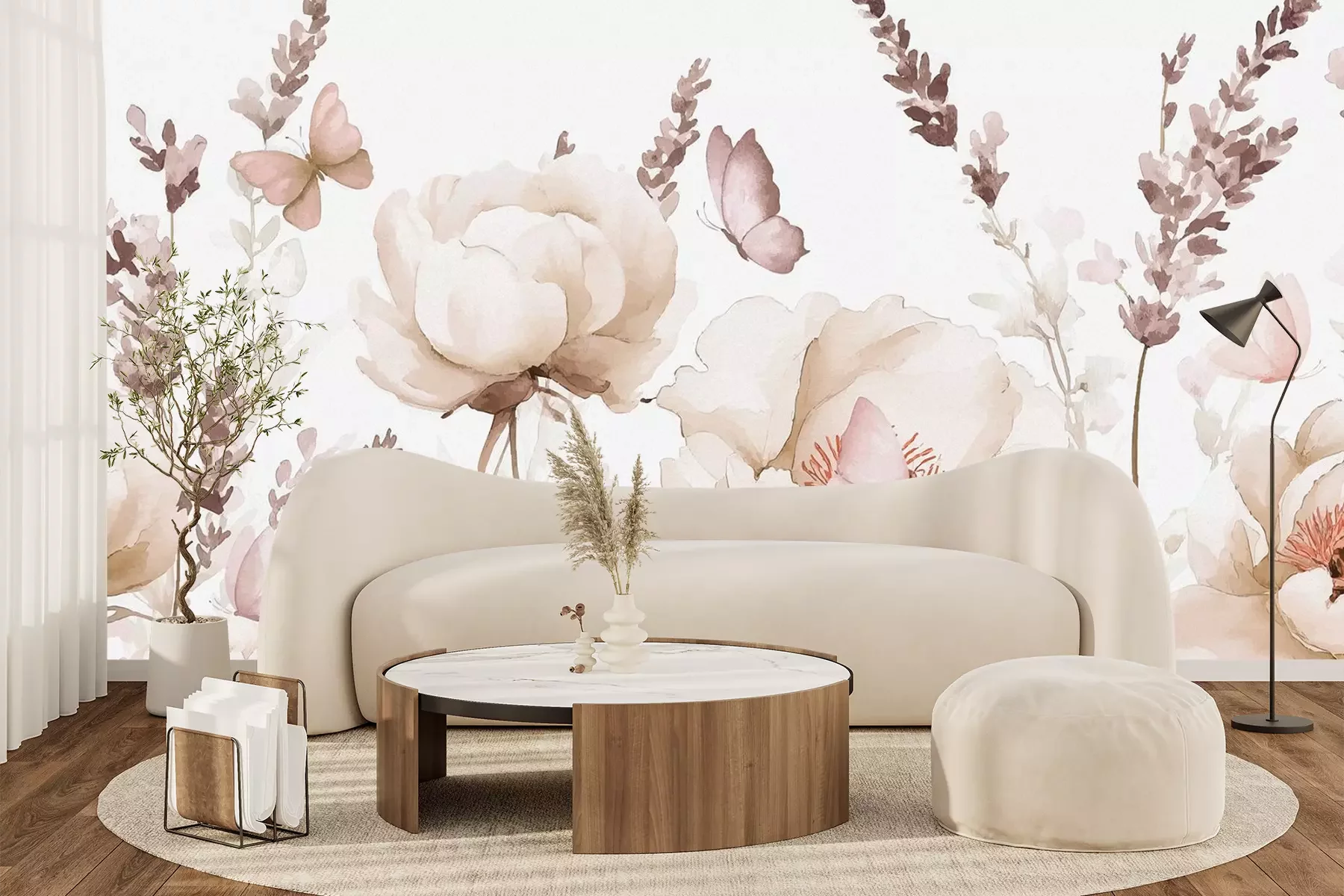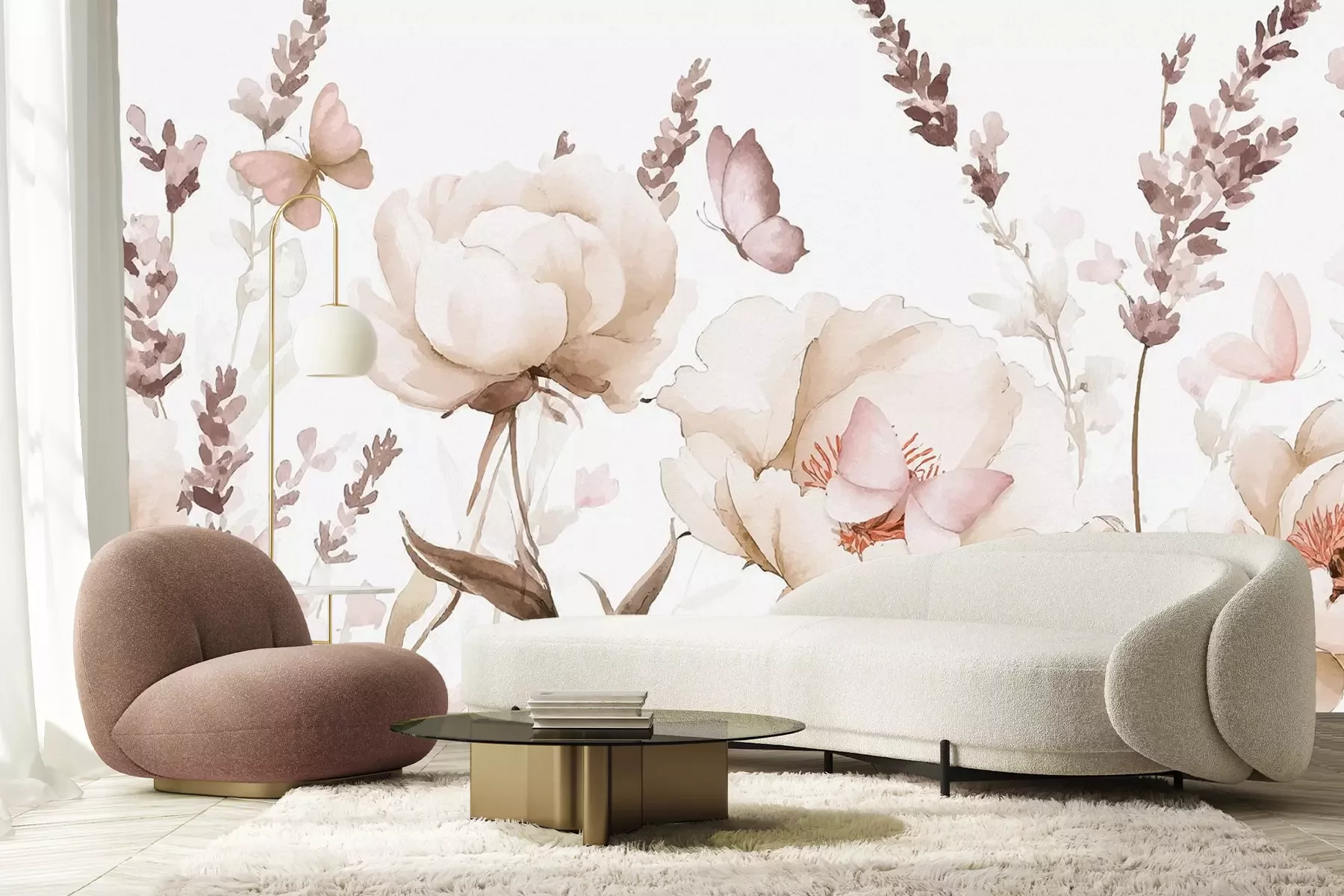 Vlinder en bloemen in een weide aquarel botanisch patroon geïnspireerd door de natuur