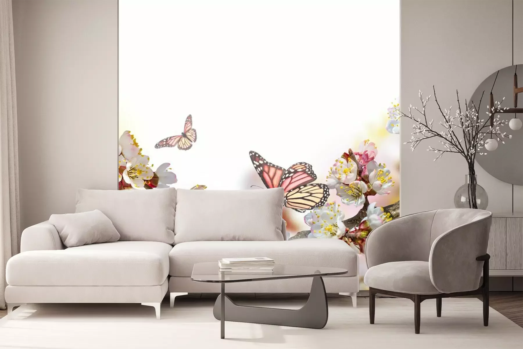 Fotobehang Vlinder op de achtergrond van lentebloemen
