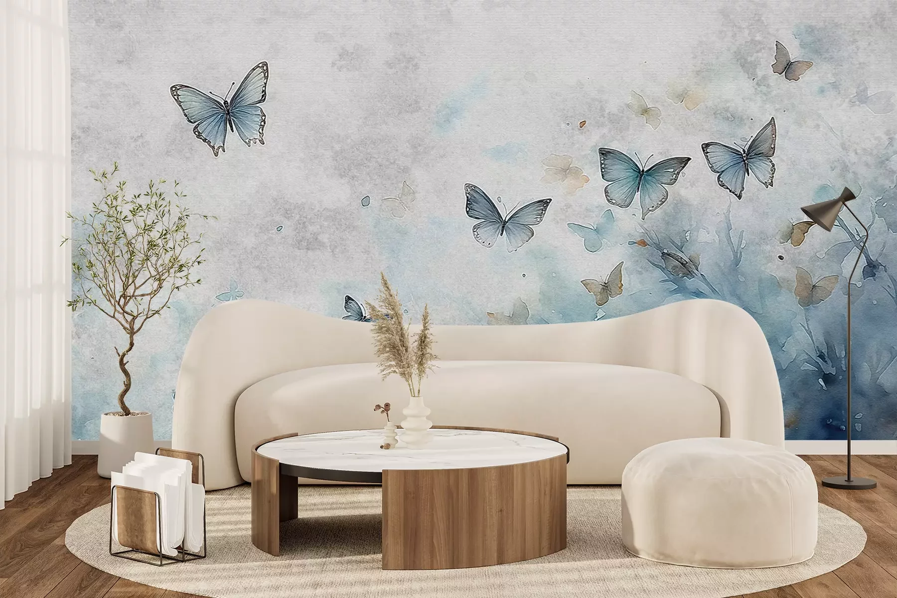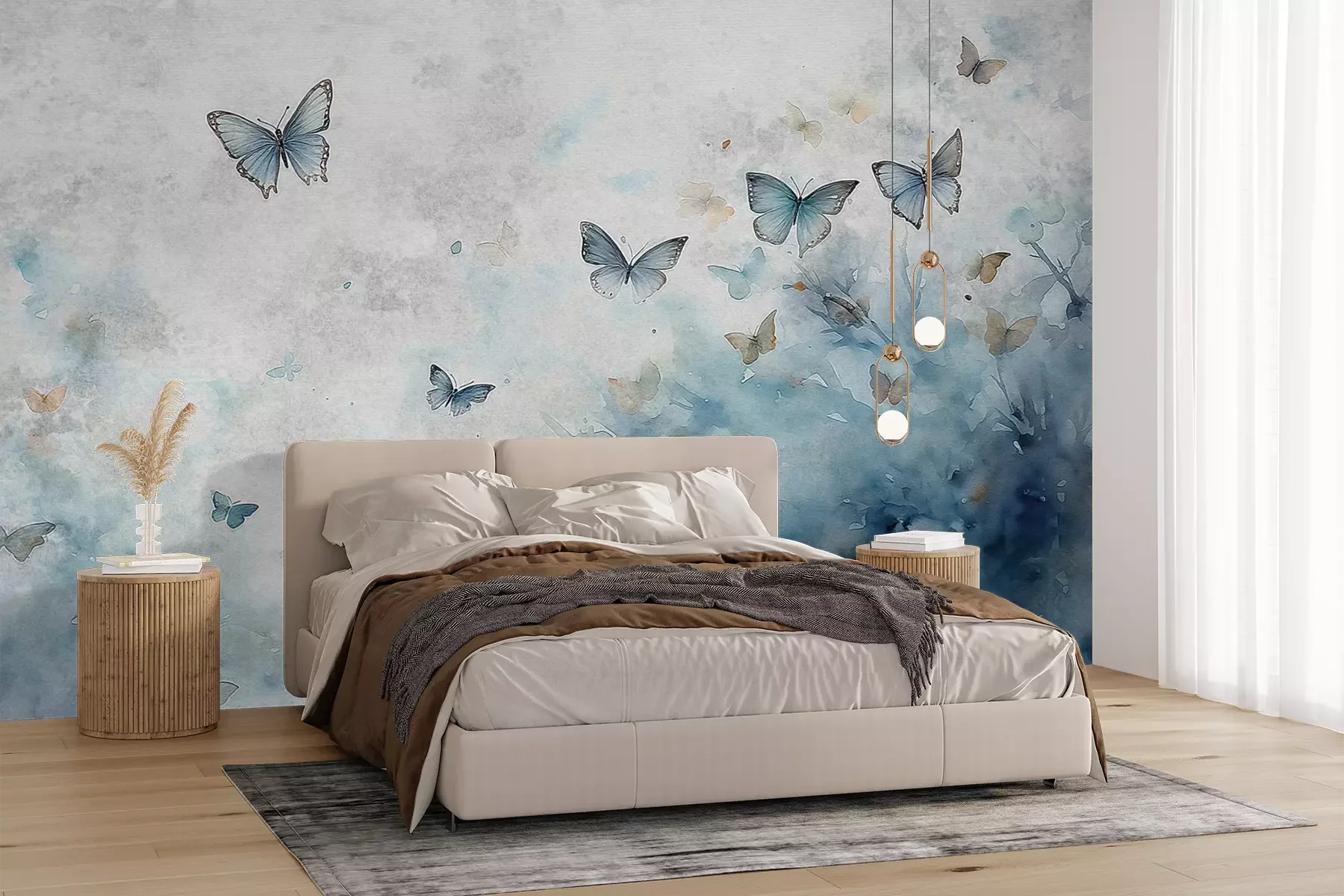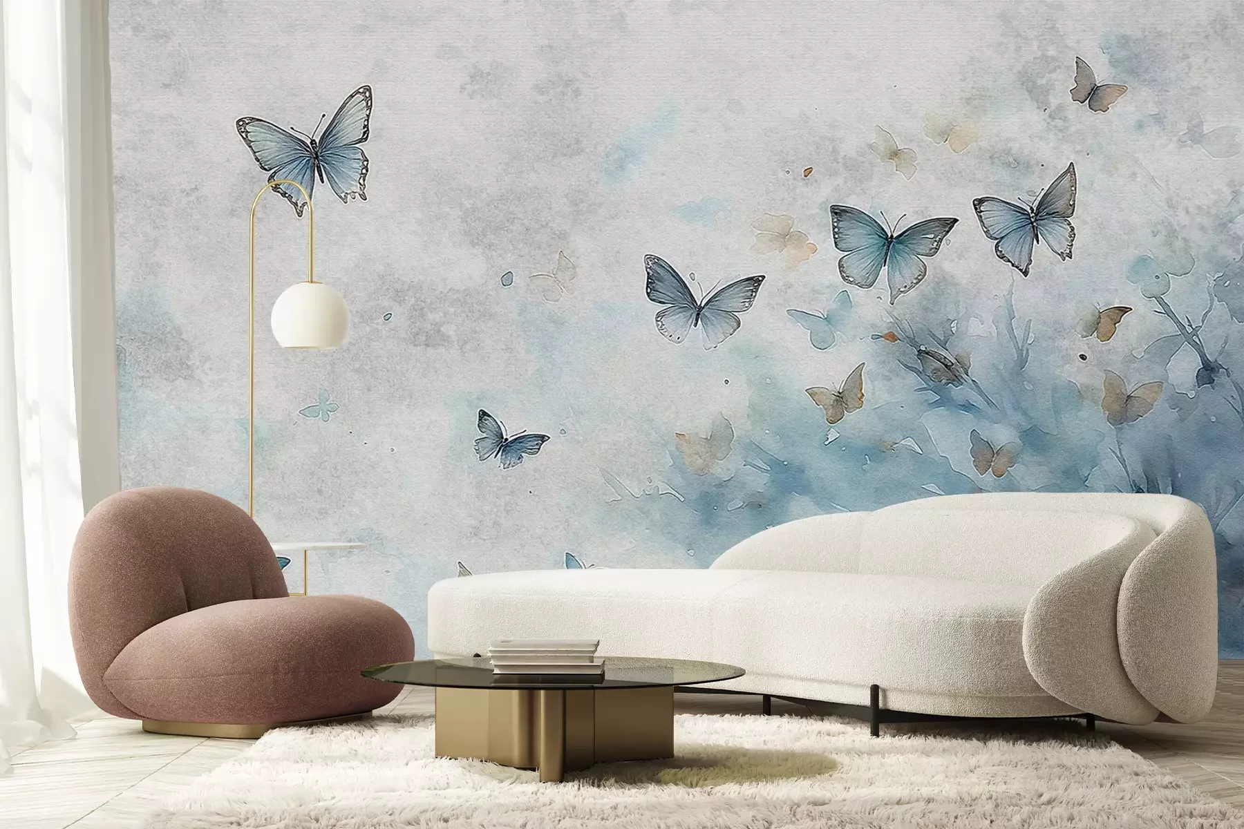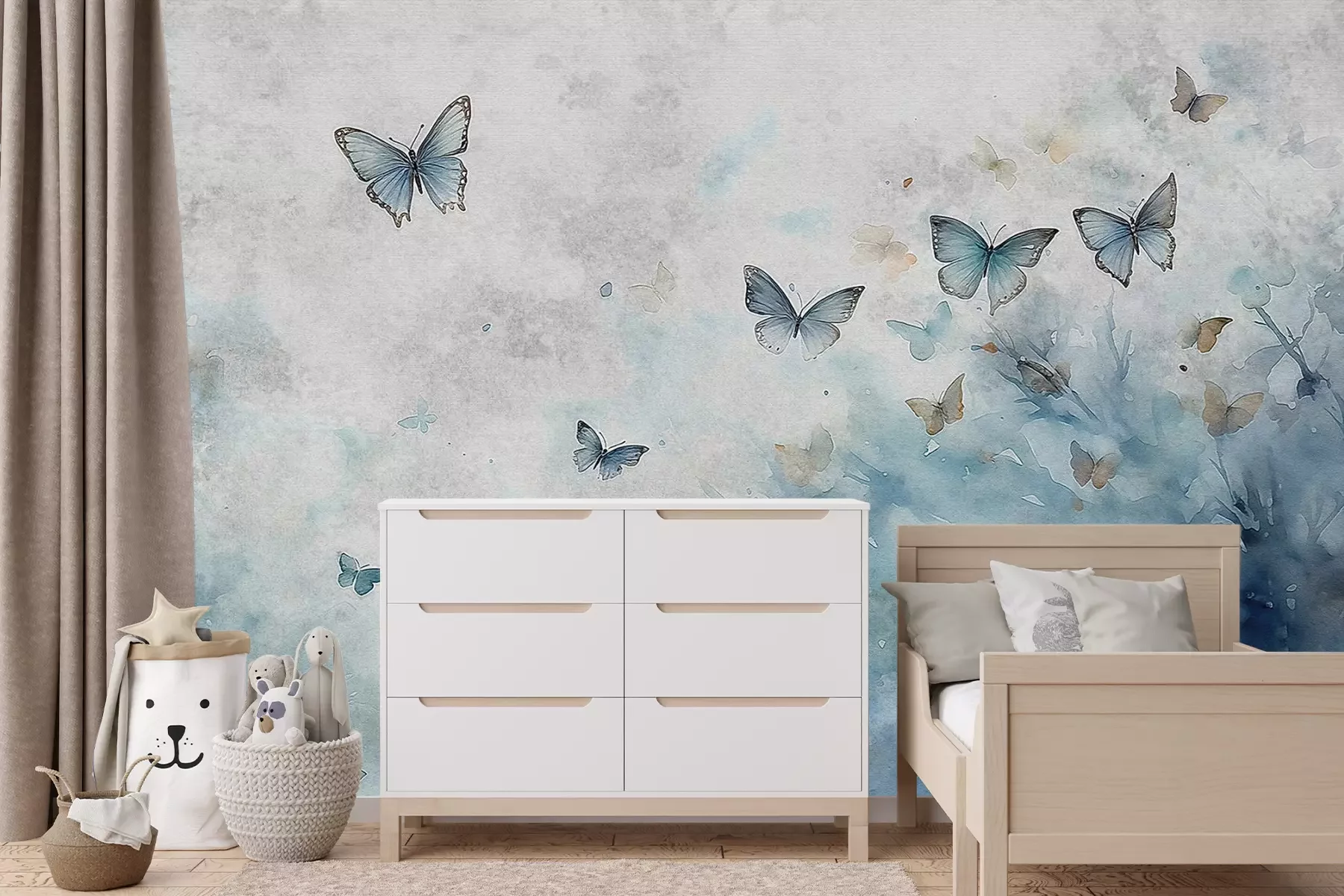 Vlinders op een aquarelachtergrond in tinten grijs en blauw, een delicaat patroon