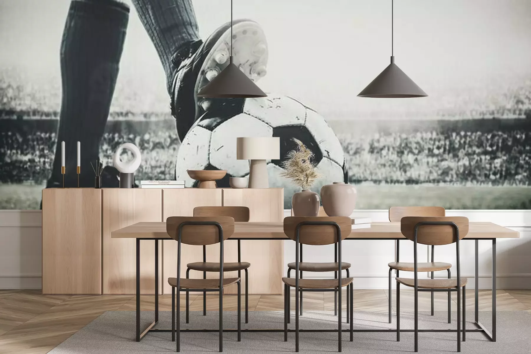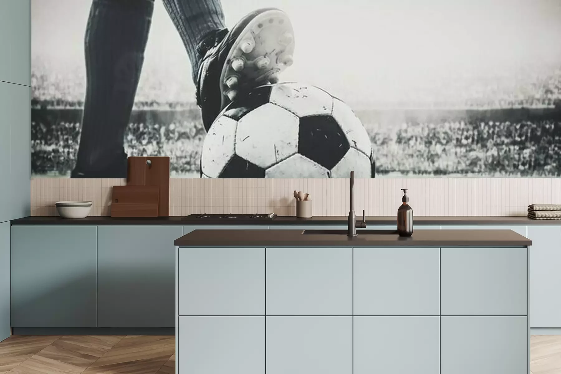 Fotobehang Voeten van voetballer betreden voetbalbal voor aftrap in het stadion zwart en wit