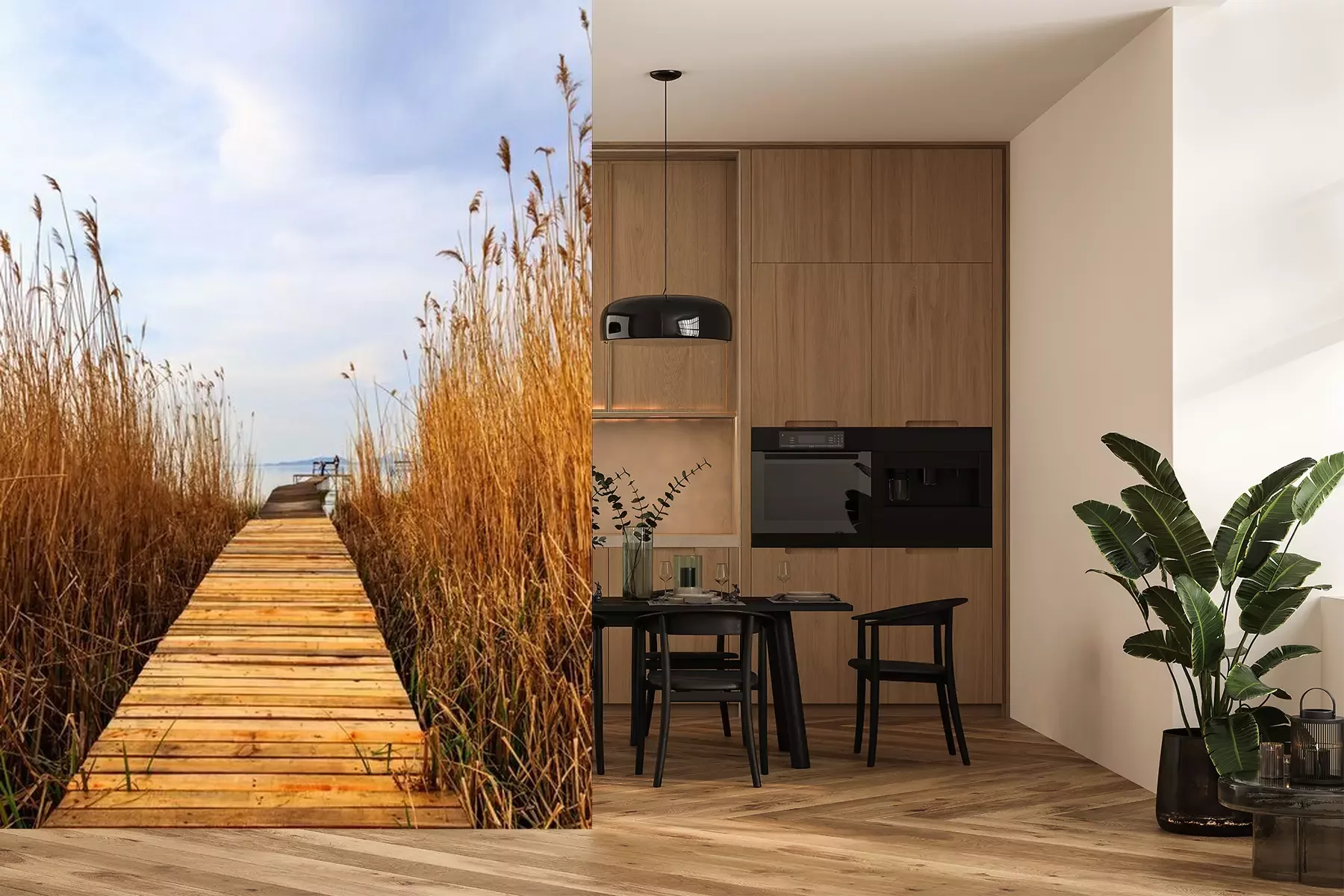 Het materiaal Premium is een glad vinyl op vlies, dat bestand is tegen uitrekken en vervorming. Het is dampdoorlatend – de muren kunnen vrij ademen – waardoor het geschikt is voor gebruik in de keuken en badkamer. Bij vervuiling kan het materiaal worden afgenomen met een vochtige doek. De maximale breedte van één baan bedraagt 95 of 105 cm, afhankelijk van de beschikbaarheid. Montage vindt plaats met de rand-aan-rand methode, wat een esthetisch resultaat zonder zichtbare naden oplevert. Omdat de lijm rechtstreeks op de muur wordt aangebracht, verloopt de installatie van het fotobehang snel en eenvoudig.