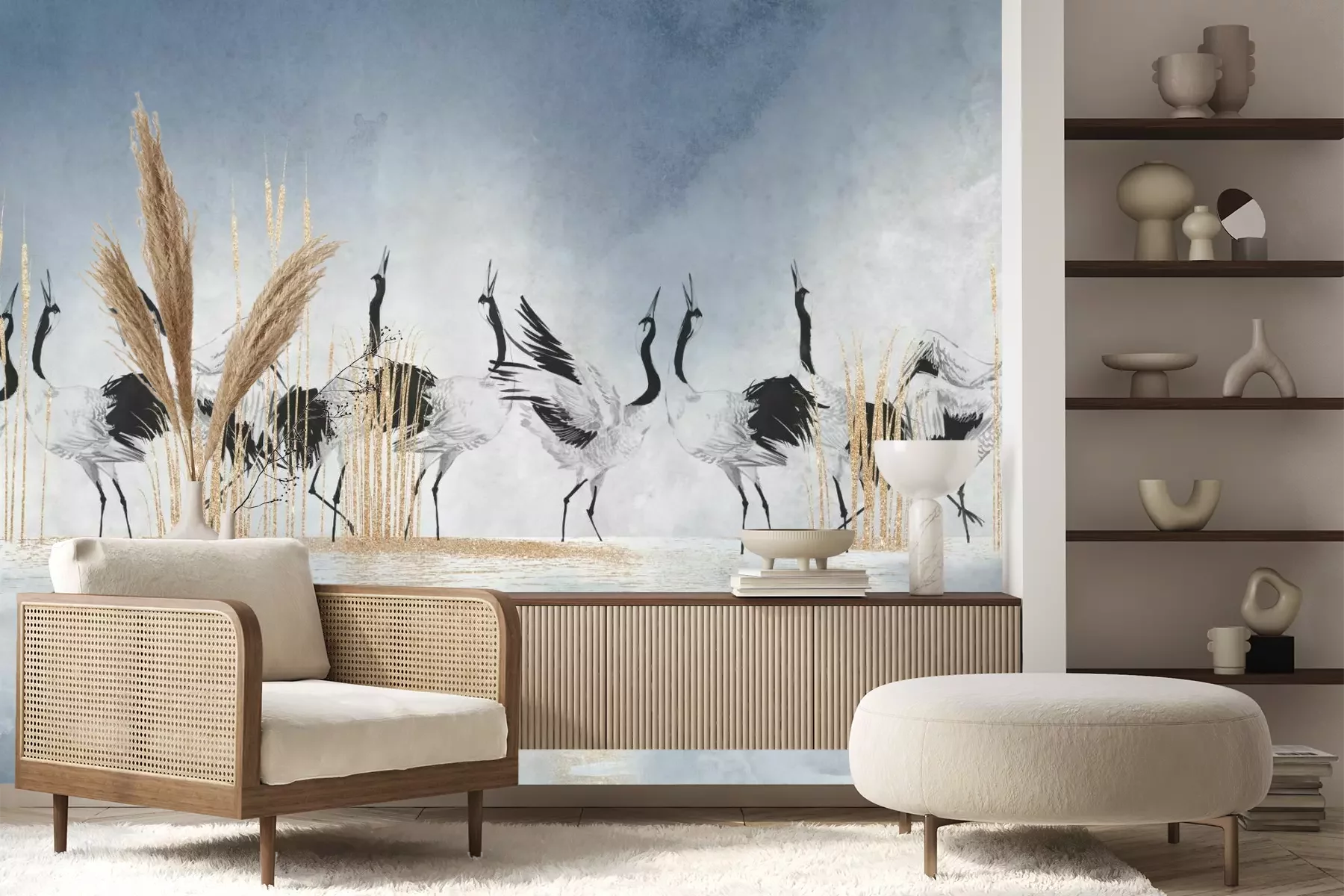 Het materiaal Premium+ is een gestructureerd vinyl op vlies met een gewicht van 255 g/m², dat kleine oneffenheden in de muur effectief camoufleert. De subtiele structuur van fijn zand geeft het oppervlak een exclusieve uitstraling, terwijl de halfmatte afwerking de diepte van de kleuren benadrukt. Het materiaal is dampdoorlatend, waardoor het ook in de keuken en badkamer kan worden gebruikt. De maximale breedte van één baan bedraagt 100 cm – bij grotere afmetingen wordt het fotobehang in meerdere gelijke banen verdeeld. De lijm wordt direct op de muur aangebracht en het behang wordt rand-aan-rand geplakt, wat zorgt voor een esthetisch resultaat zonder zichtbare naden. Het oppervlak kan gemakkelijk worden schoongemaakt door het voorzichtig af te nemen met een vochtige doek.