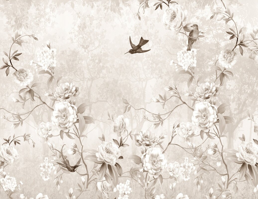Fotobehang: Vogels in een tuin vol bloemen en bomen