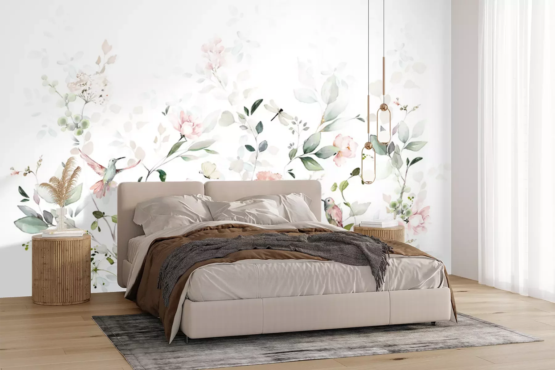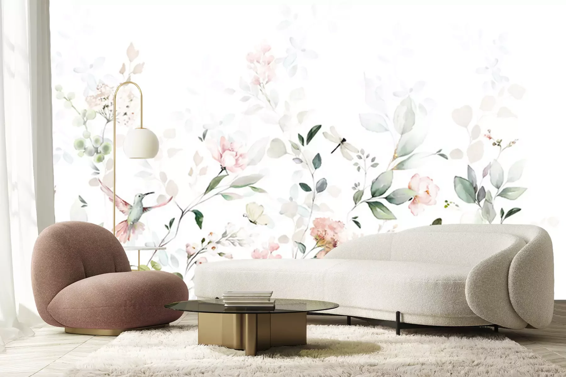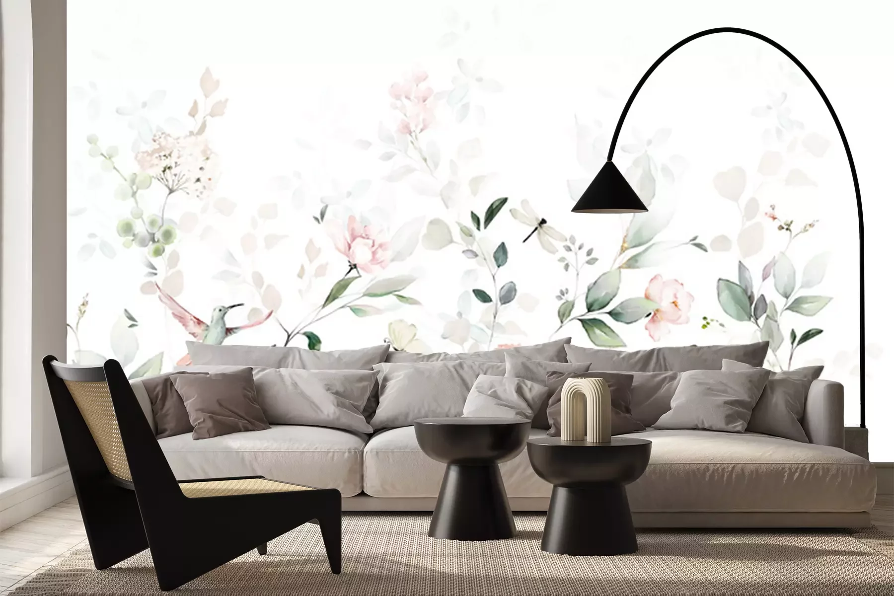 Fotobehang Vogels tussen aquarel takjes op witte achtergrond