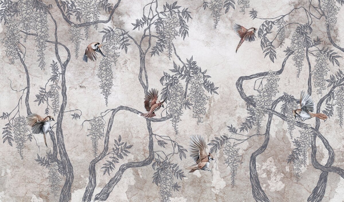 Fotobehang: Vogels tussen de blauweregenbloemen