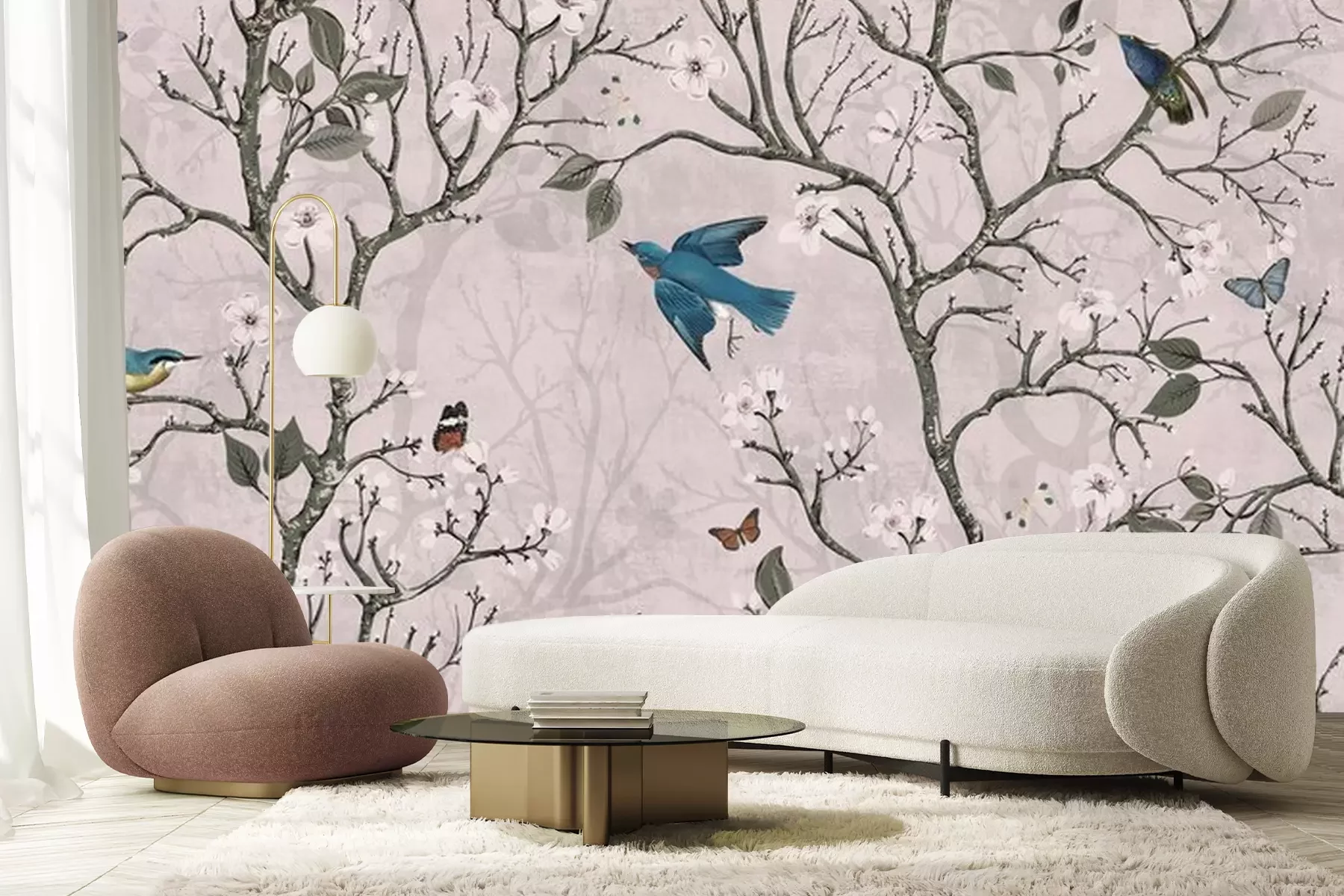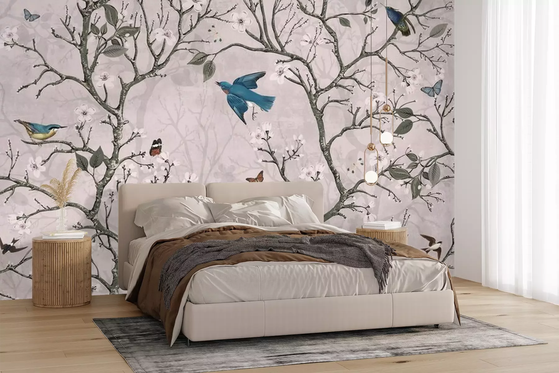 Fotobehang Vogels vliegen tussen bomen in retro stijl