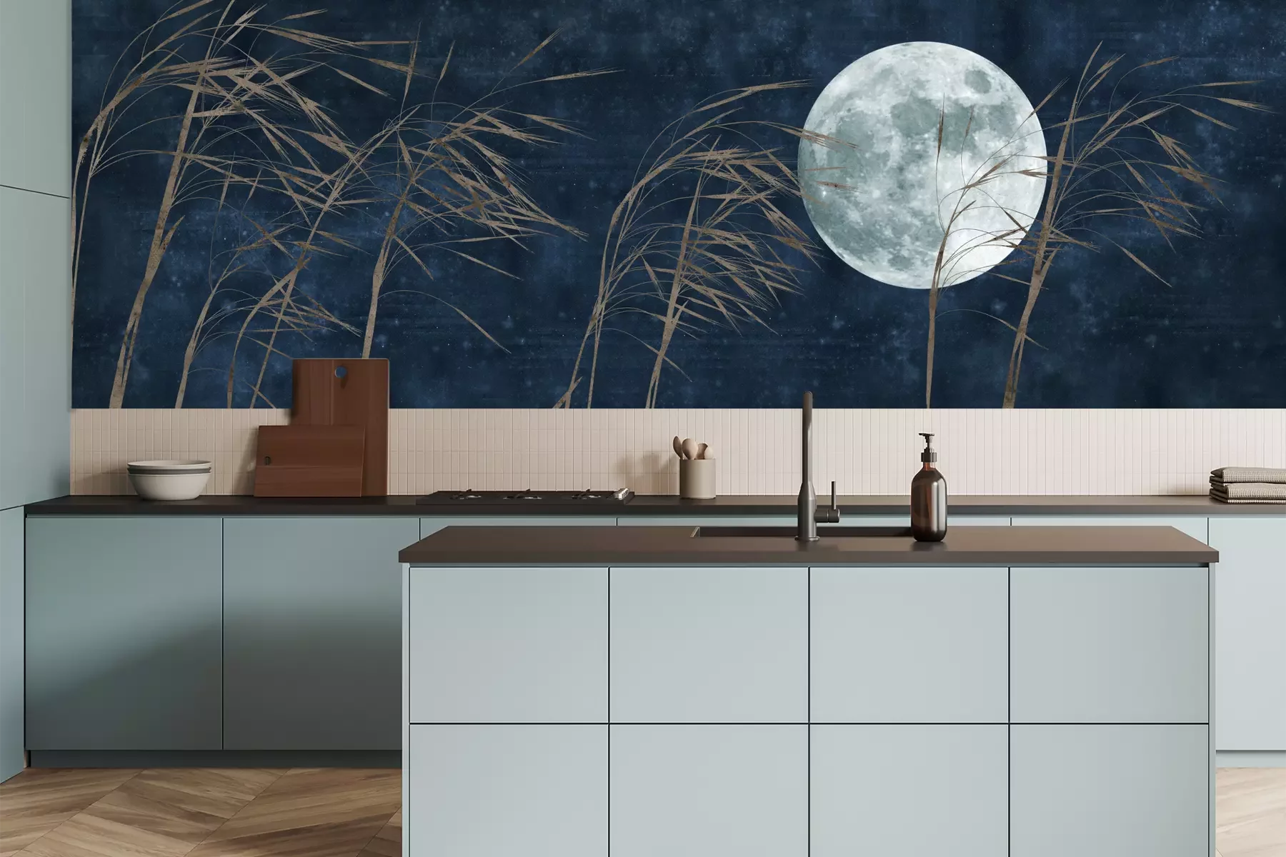 Het materiaal Premium is een glad vinyl op vlies, dat bestand is tegen uitrekken en vervorming. Het is dampdoorlatend – de muren kunnen vrij ademen – waardoor het geschikt is voor gebruik in de keuken en badkamer. Bij vervuiling kan het materiaal worden afgenomen met een vochtige doek. De maximale breedte van één baan bedraagt 95 of 105 cm, afhankelijk van de beschikbaarheid. Montage vindt plaats met de rand-aan-rand methode, wat een esthetisch resultaat zonder zichtbare naden oplevert. Omdat de lijm rechtstreeks op de muur wordt aangebracht, verloopt de installatie van het fotobehang snel en eenvoudig.