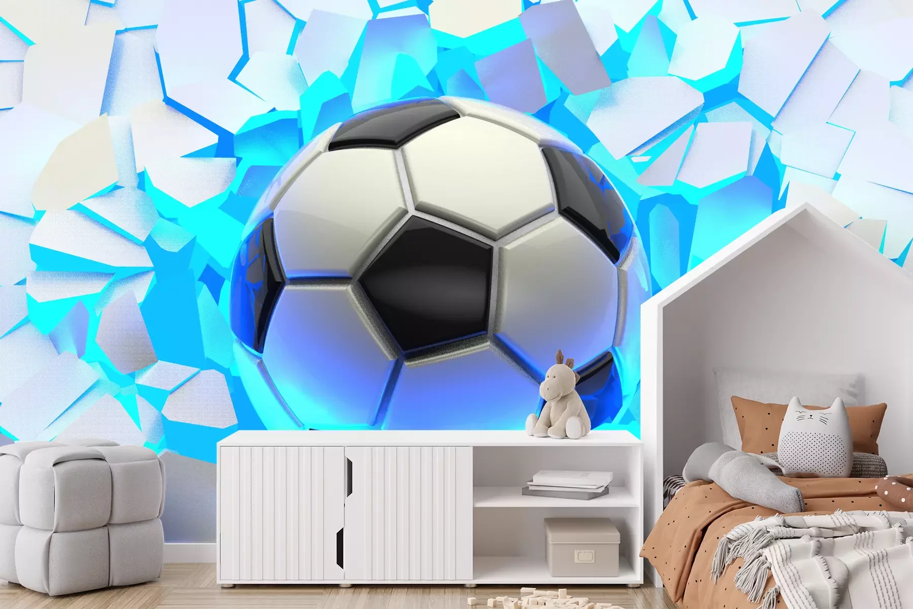 Het hier gepresenteerde fotobehang voor een jongenskamer met een voetbal-motief is een uitstekende oplossing als je kind geïnteresseerd is in sport. Op deze manier wordt de muurdecoratie niet alleen een versiering van de kamer, maar ook een manier om de passie van het kind te benadrukken. Wat direct opvalt, is het driedimensionale karakter van het fotobehang. Voetbal 3D, die lijkt binnen te vallen door een gebroken muur, is een zeer opvallend decoratief motief dat de ruimte optisch vergroot. Zo’n patroon op de muur zorgt ervoor dat de kamer zich visueel opent naar extra ruimte, wat de perceptie van de oppervlakte verandert. Een belangrijk aspect is ook de kleurstelling van het fotobehang. Voetbal is weergegeven in de traditionele zwart-witte kleurencombinatie, maar wat de aandacht trekt, is de neonblauwe gloed rondom de bal. Juist dit element maakt dit fotobehang voor een jongenskamer zo opvallend. Het patroon geeft de indruk alsof het licht geeft, wat je kind zeker leuk zal vinden, omdat het interieur hierdoor een unieke uitstraling krijgt. Doordat je de afmetingen van ons fotobehang kunt aanpassen aan de muur die je wilt decoreren, kun je eenvoudig zowel een kleine als een ruime kinderkamer inrichten. Hoewel het niet volledig een abstract fotobehang is, aangezien het in een sportthema is geplaatst, is de compositie verrassend genoeg om een werkelijk uniek effect in de ruimte te creëren. Het hier getoonde patroon zal zowel in de kamer van een jonge jongen als in een tienerkamer prachtig staan. Een voordeel van zo’n sportief abstract fotobehang is dat als je kind van voetbal houdt, hij niet snel uit deze decoratie zal groeien. Een goede plek voor zo’n patroon is de muur bij de speelhoek of bij het bureau. Je krijgt een geweldig visueel effect als er ook andere blauwe elementen in de kamer zijn die passen bij de neonachtige gloed van het fotobehang. Voetbal die op de muurdecoratie wordt weergegeven, zal zich daardoor nog beter in het interieurontwerp voegen.