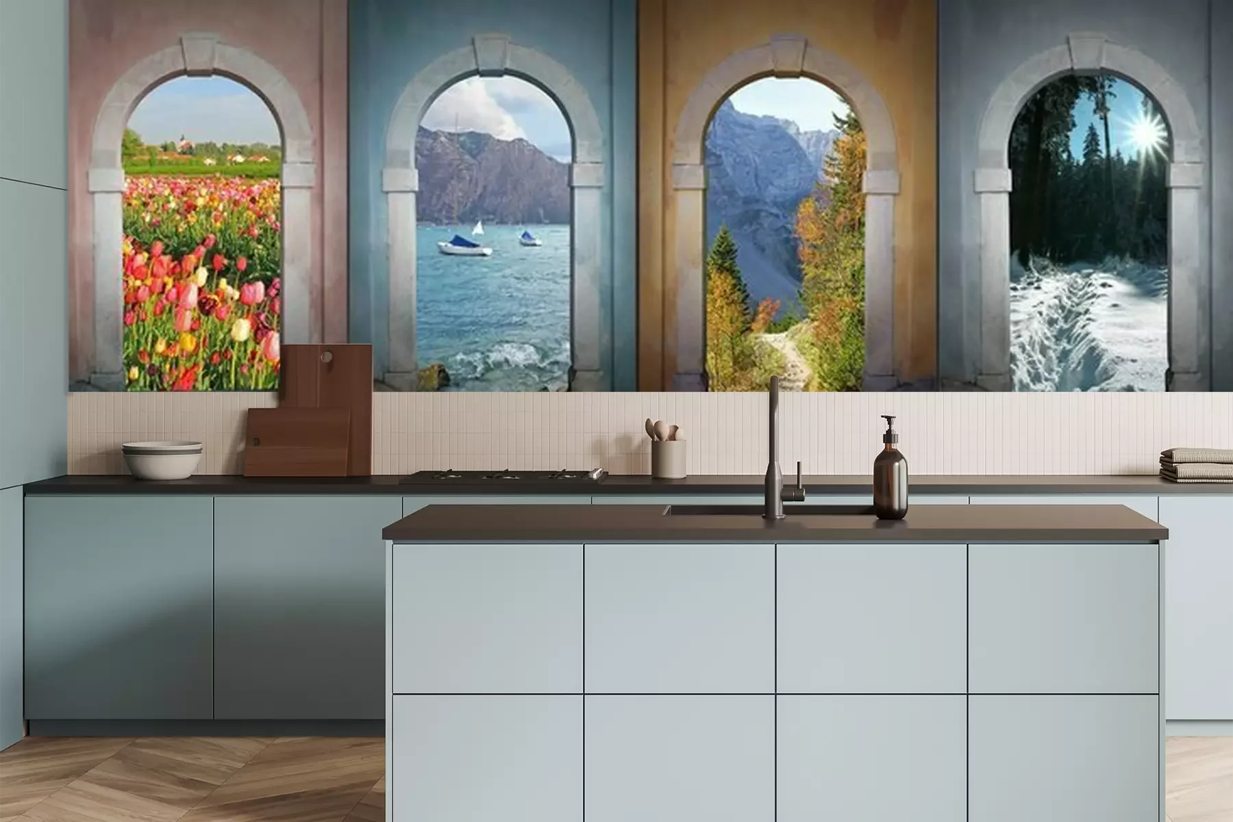 Het materiaal Premium is een glad vinyl op vlies, dat bestand is tegen uitrekken en vervorming. Het is dampdoorlatend – de muren kunnen vrij ademen – waardoor het geschikt is voor gebruik in de keuken en badkamer. Bij vervuiling kan het materiaal worden afgenomen met een vochtige doek. De maximale breedte van één baan bedraagt 95 of 105 cm, afhankelijk van de beschikbaarheid. Montage vindt plaats met de rand-aan-rand methode, wat een esthetisch resultaat zonder zichtbare naden oplevert. Omdat de lijm rechtstreeks op de muur wordt aangebracht, verloopt de installatie van het fotobehang snel en eenvoudig.