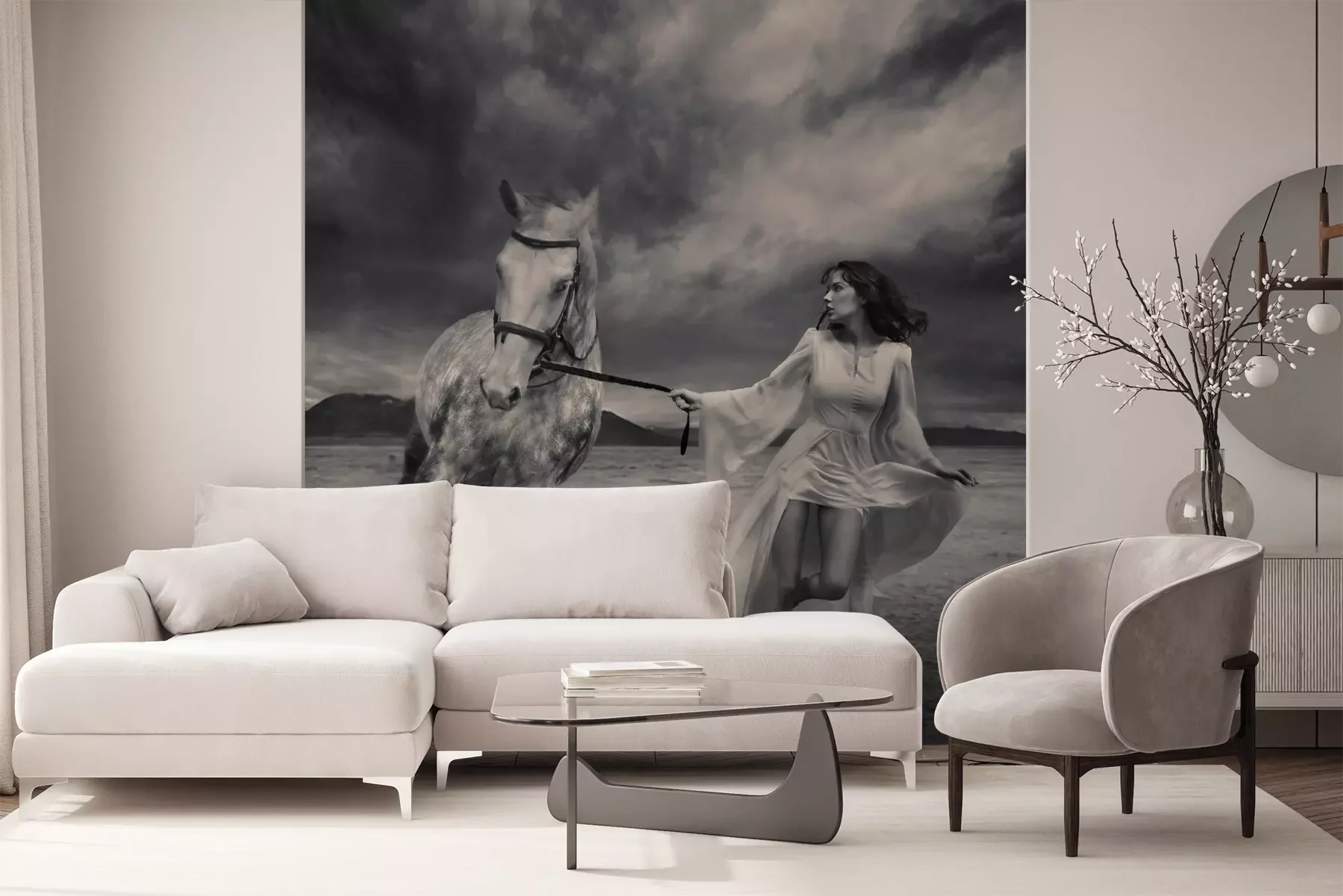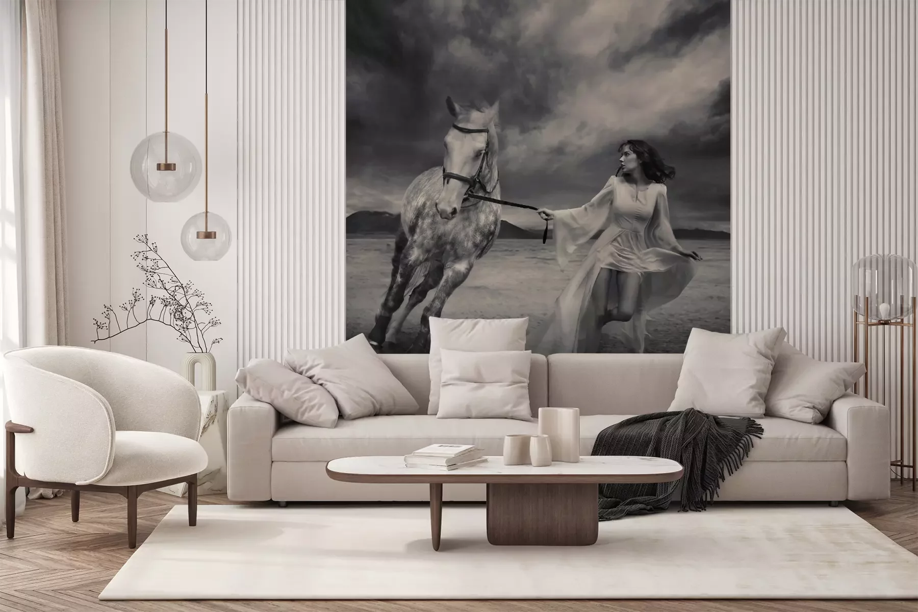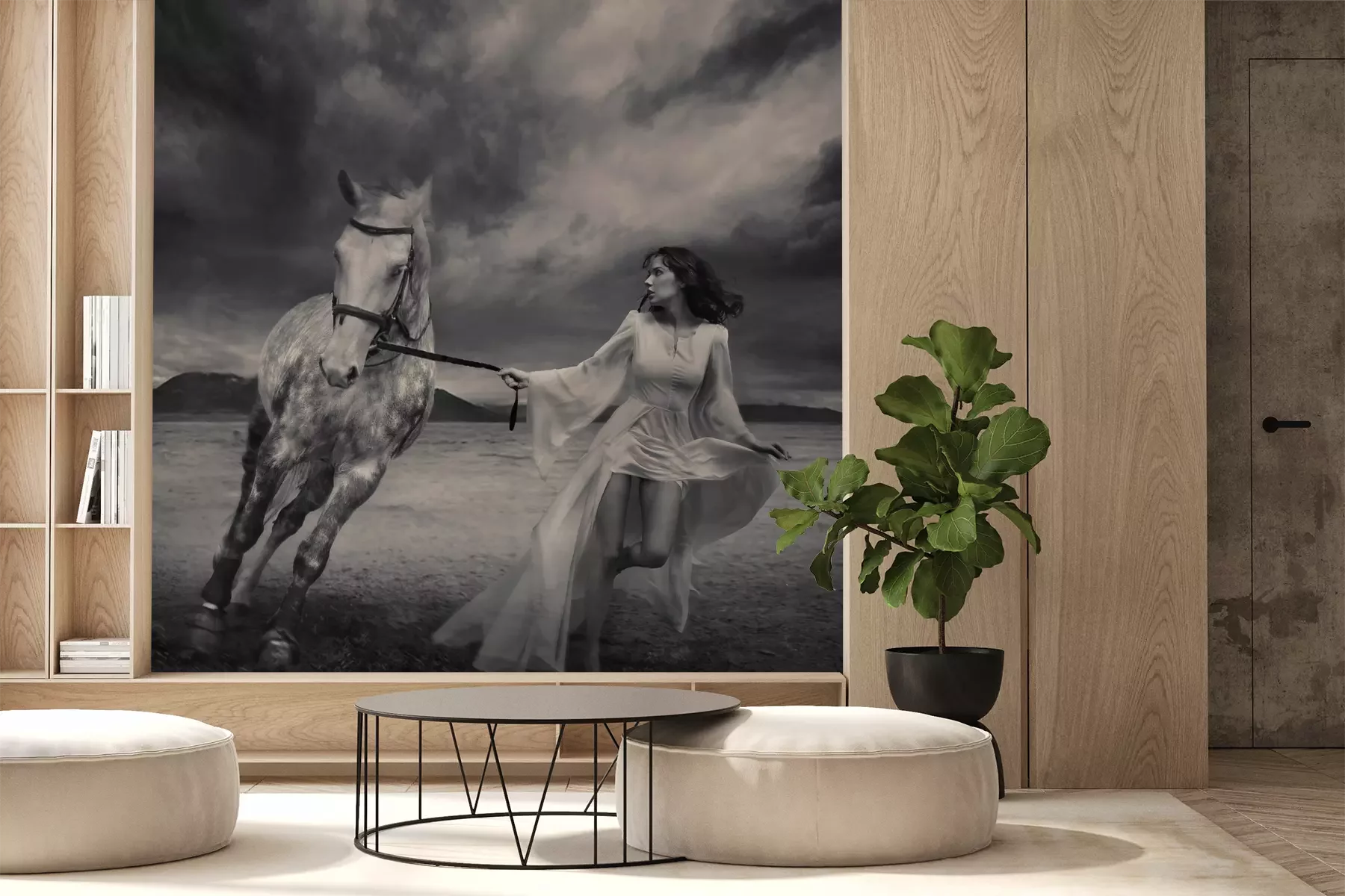 Het materiaal Premium+ is een gestructureerd vinyl op vlies met een gewicht van 255 g/m², dat kleine oneffenheden in de muur effectief camoufleert. De subtiele structuur van fijn zand geeft het oppervlak een exclusieve uitstraling, terwijl de halfmatte afwerking de diepte van de kleuren benadrukt. Het materiaal is dampdoorlatend, waardoor het ook in de keuken en badkamer kan worden gebruikt. De maximale breedte van één baan bedraagt 100 cm – bij grotere afmetingen wordt het fotobehang in meerdere gelijke banen verdeeld. De lijm wordt direct op de muur aangebracht en het behang wordt rand-aan-rand geplakt, wat zorgt voor een esthetisch resultaat zonder zichtbare naden. Het oppervlak kan gemakkelijk worden schoongemaakt door het voorzichtig af te nemen met een vochtige doek.