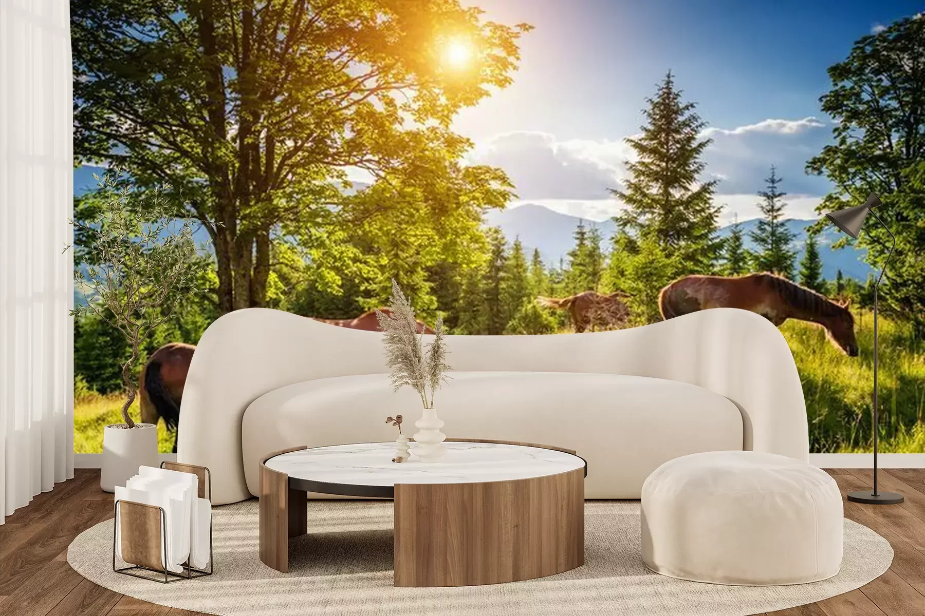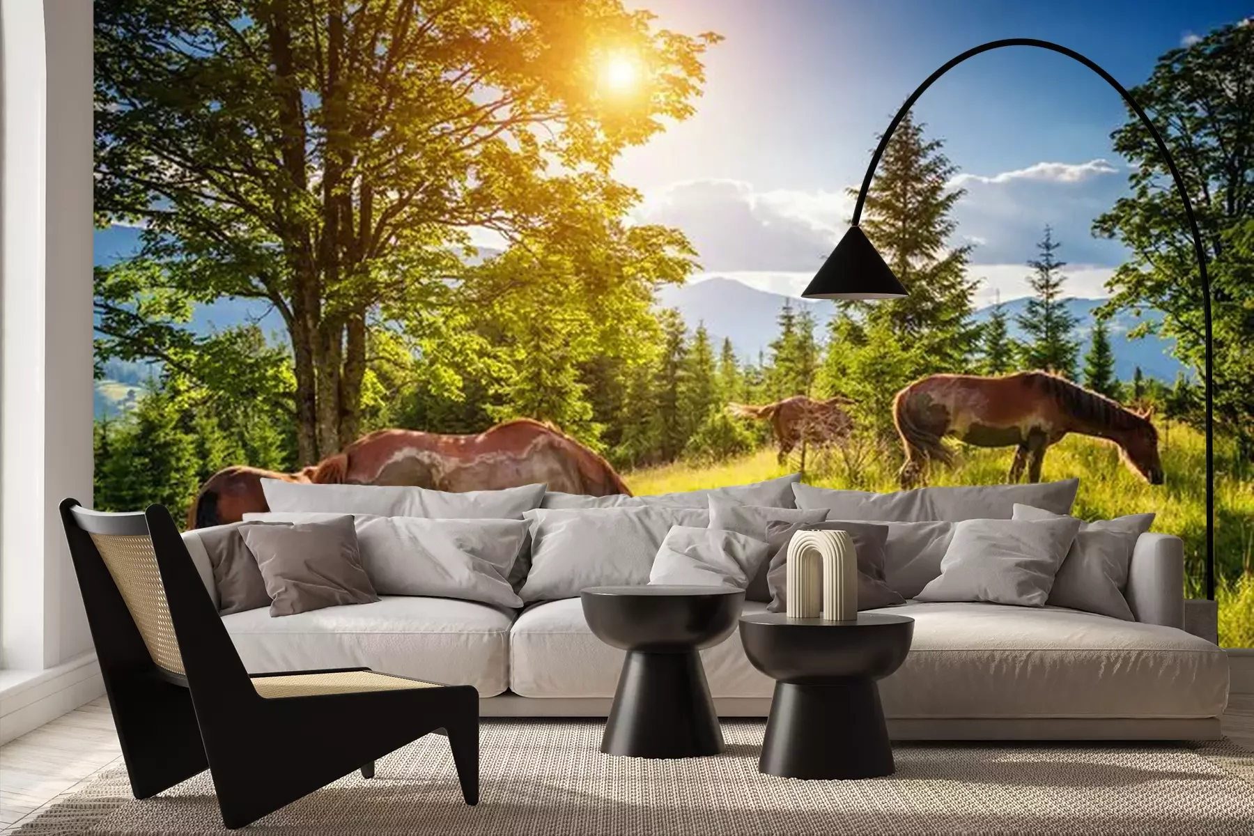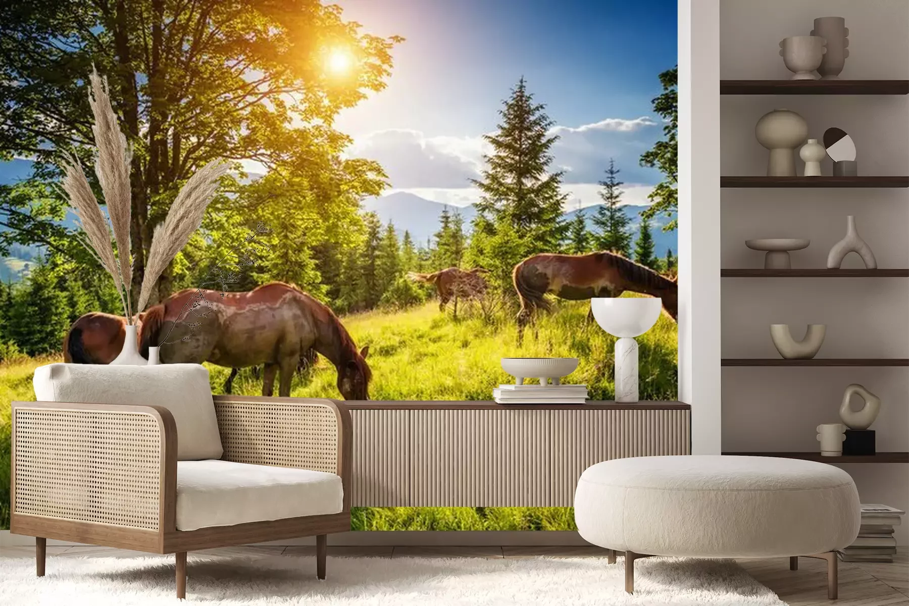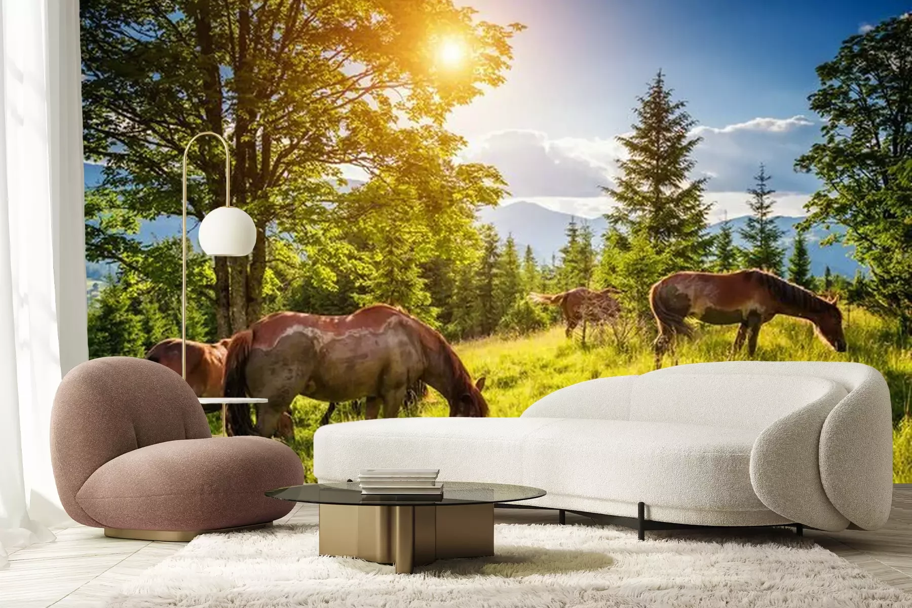 Fotobehang Vuile paarden weiden in het weiland dat door de zon wordt verlicht. Locatie plaats Karpaten, Oekraïne, Europa. Schoonheidswereld.