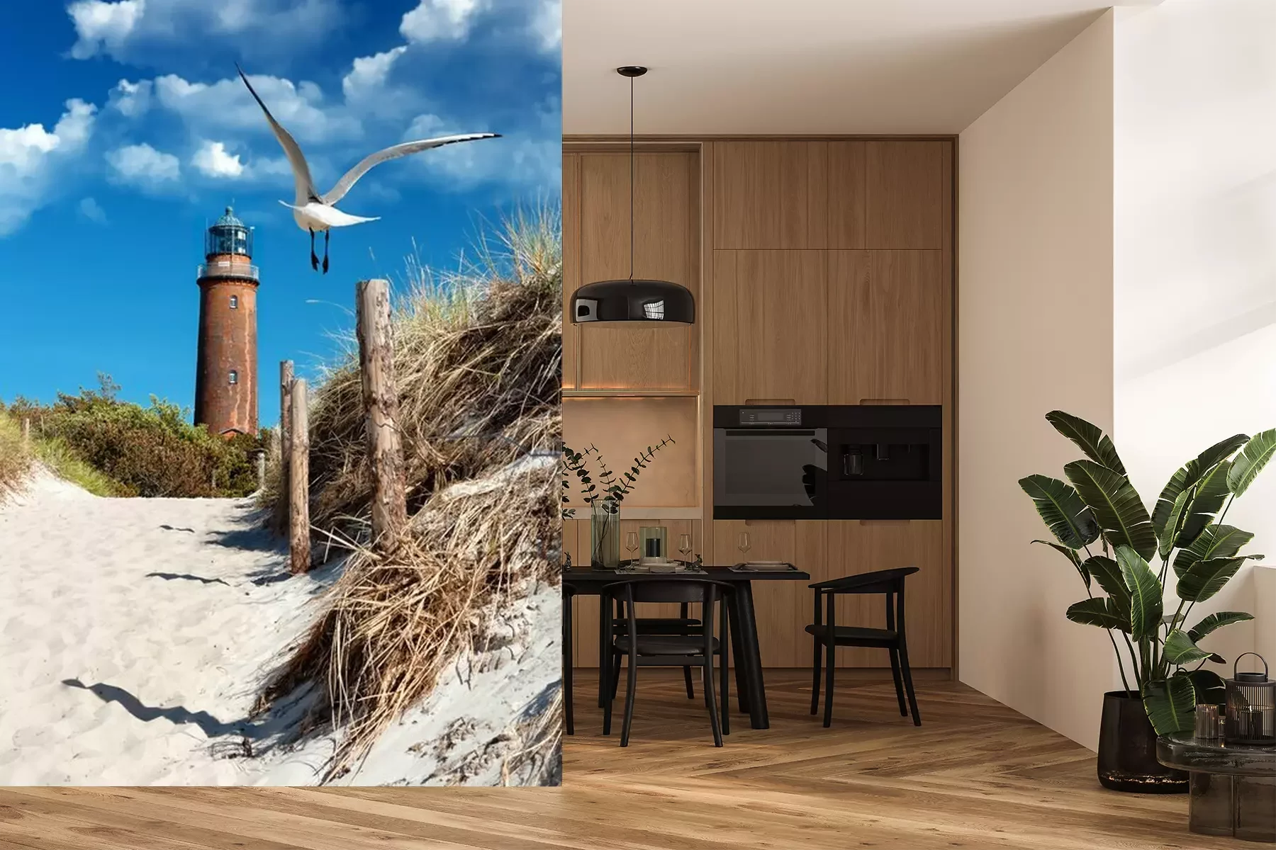Het materiaal Premium+ is een gestructureerd vinyl op vlies met een gewicht van 255 g/m², dat kleine oneffenheden in de muur effectief camoufleert. De subtiele structuur van fijn zand geeft het oppervlak een exclusieve uitstraling, terwijl de halfmatte afwerking de diepte van de kleuren benadrukt. Het materiaal is dampdoorlatend, waardoor het ook in de keuken en badkamer kan worden gebruikt. De maximale breedte van één baan bedraagt 100 cm – bij grotere afmetingen wordt het fotobehang in meerdere gelijke banen verdeeld. De lijm wordt direct op de muur aangebracht en het behang wordt rand-aan-rand geplakt, wat zorgt voor een esthetisch resultaat zonder zichtbare naden. Het oppervlak kan gemakkelijk worden schoongemaakt door het voorzichtig af te nemen met een vochtige doek.