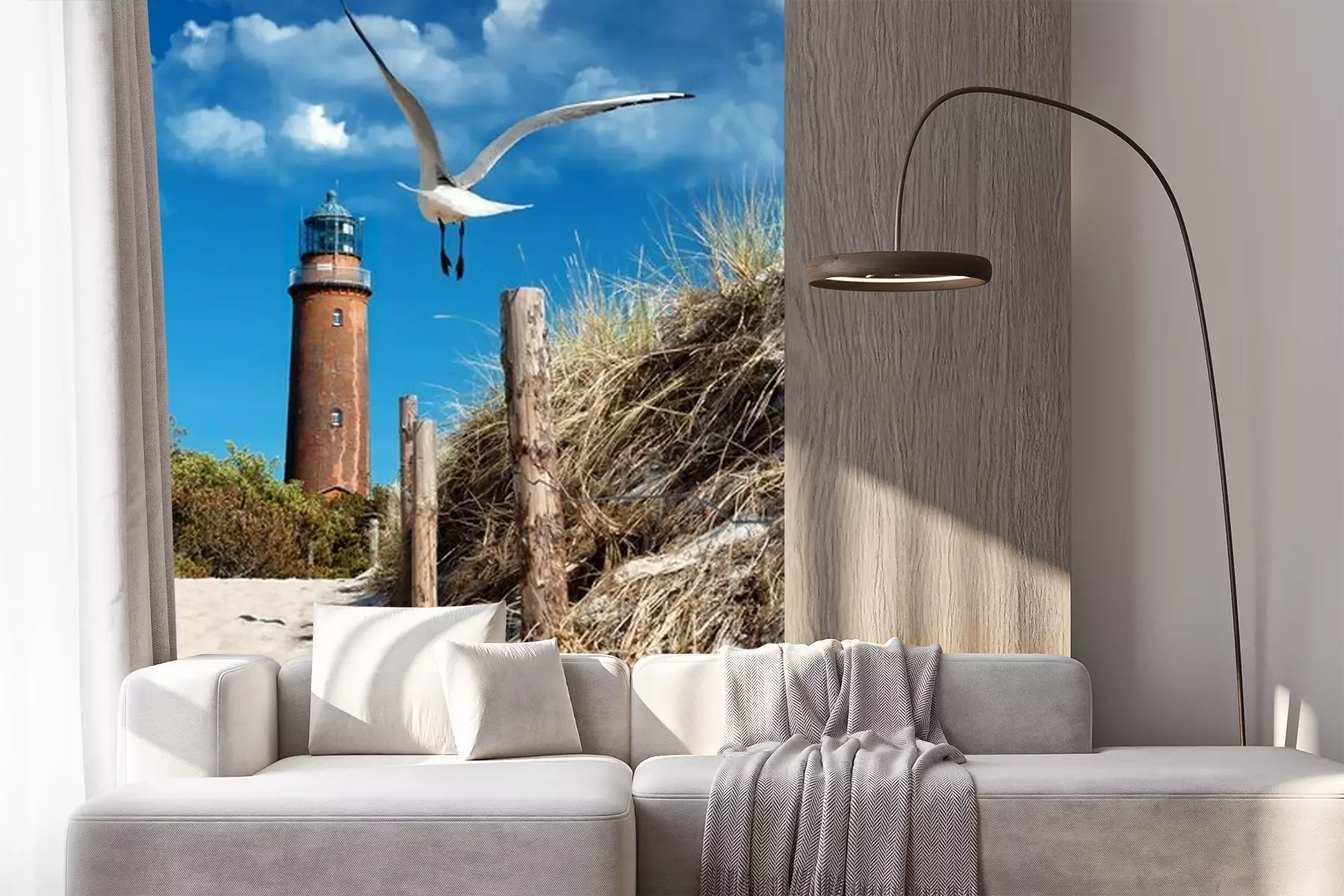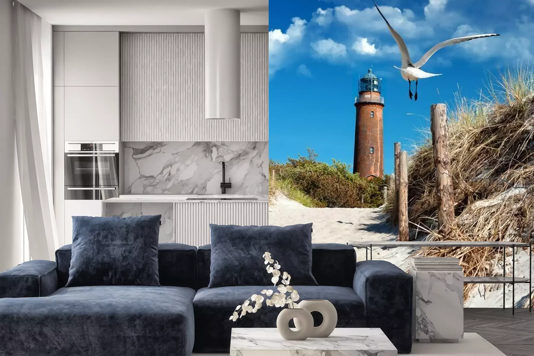 Meeuwen, zee en golfbrekerFotobehang