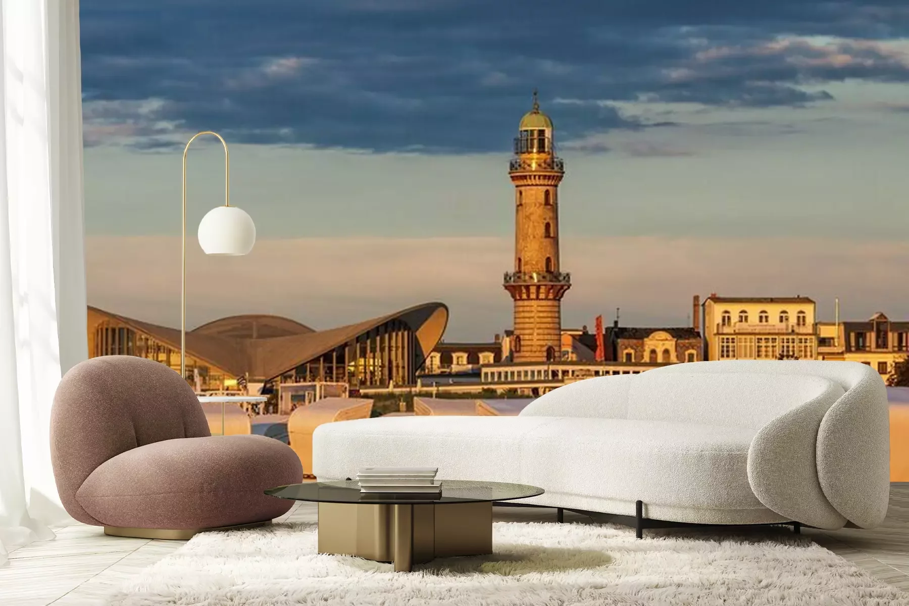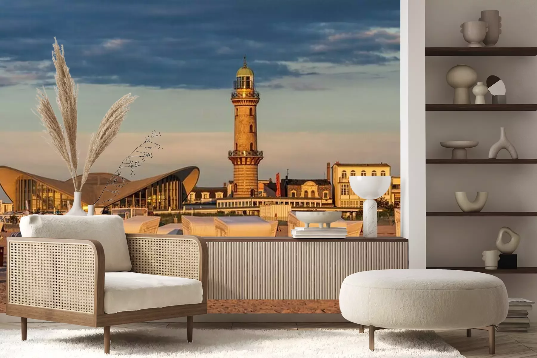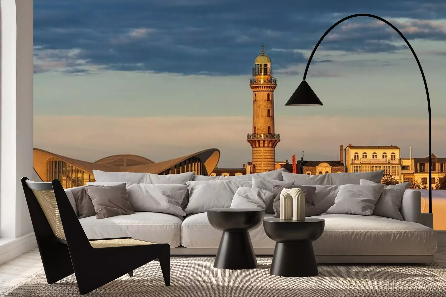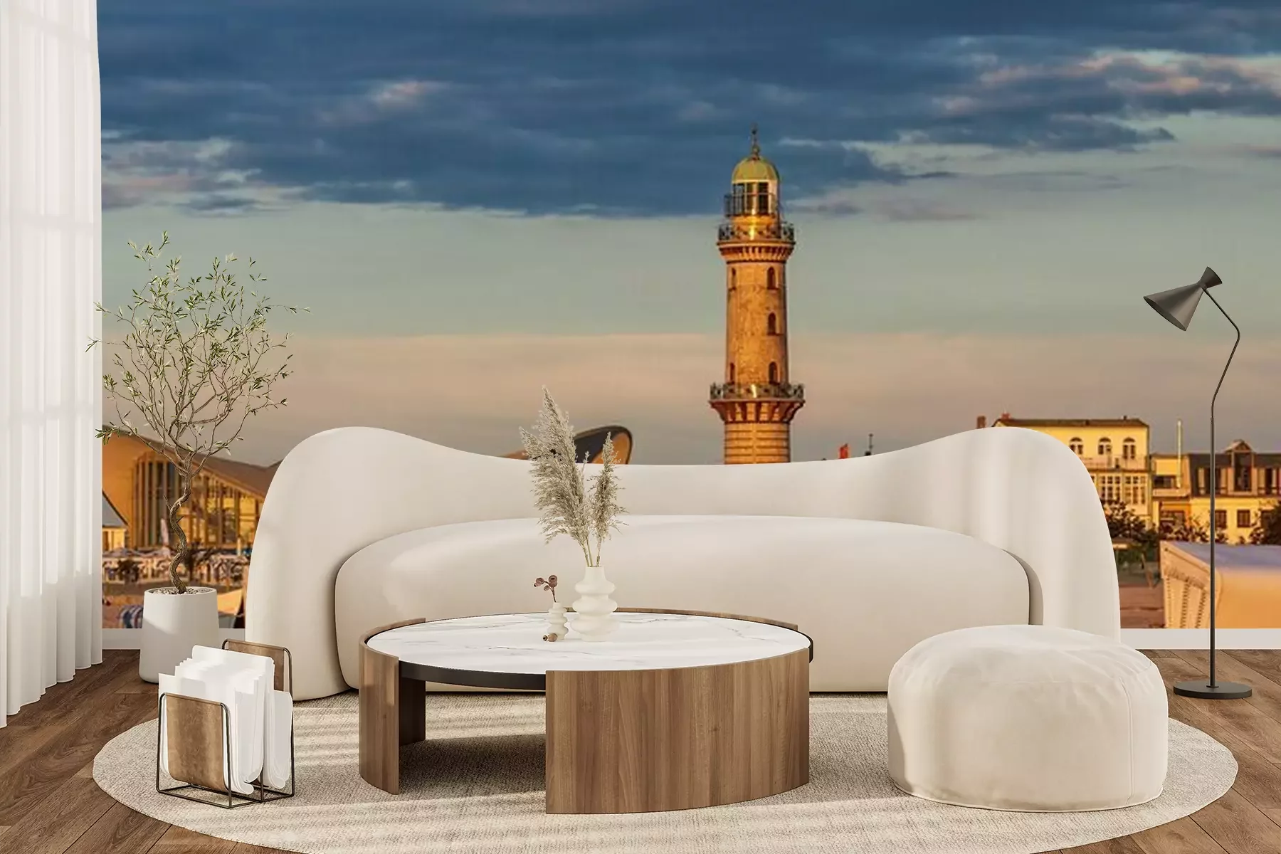 Fotobehang Vuurtoren Warnow monding bij zonsondergang