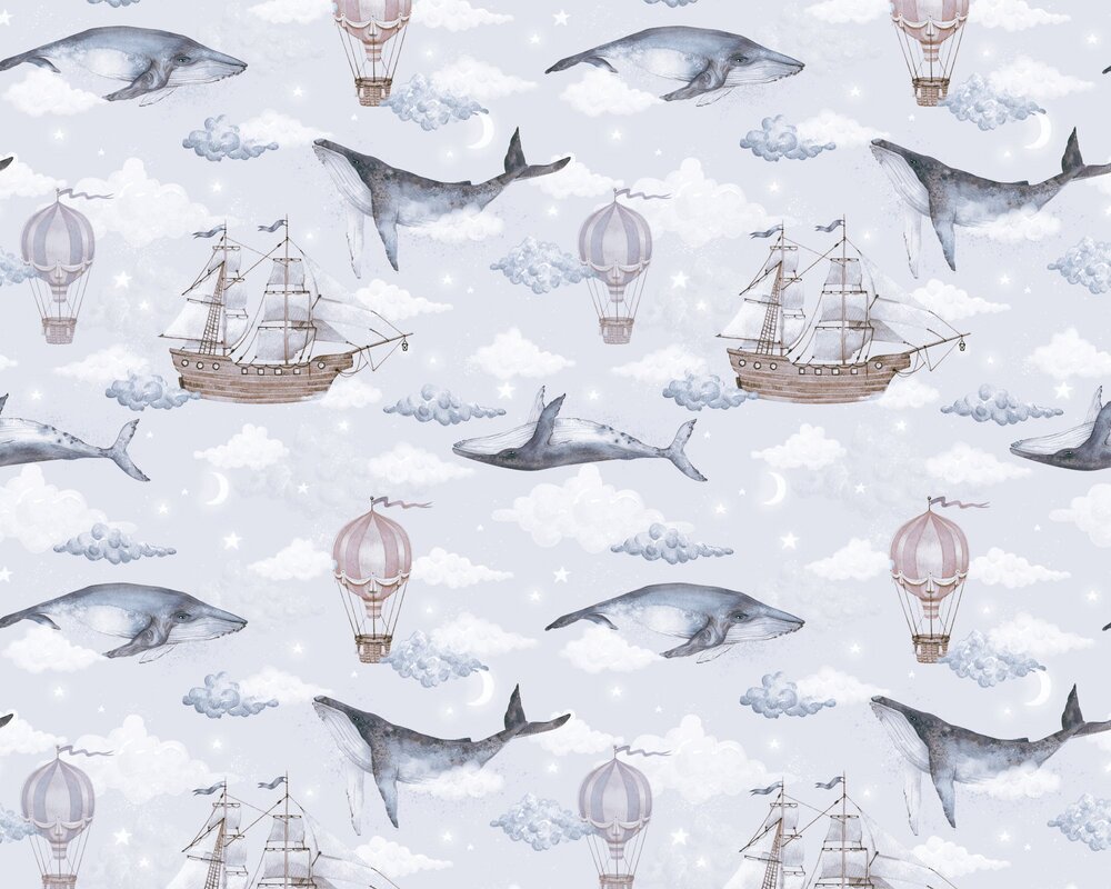 Fotobehang: Walvissen en schepen tegen een bewolkte lucht