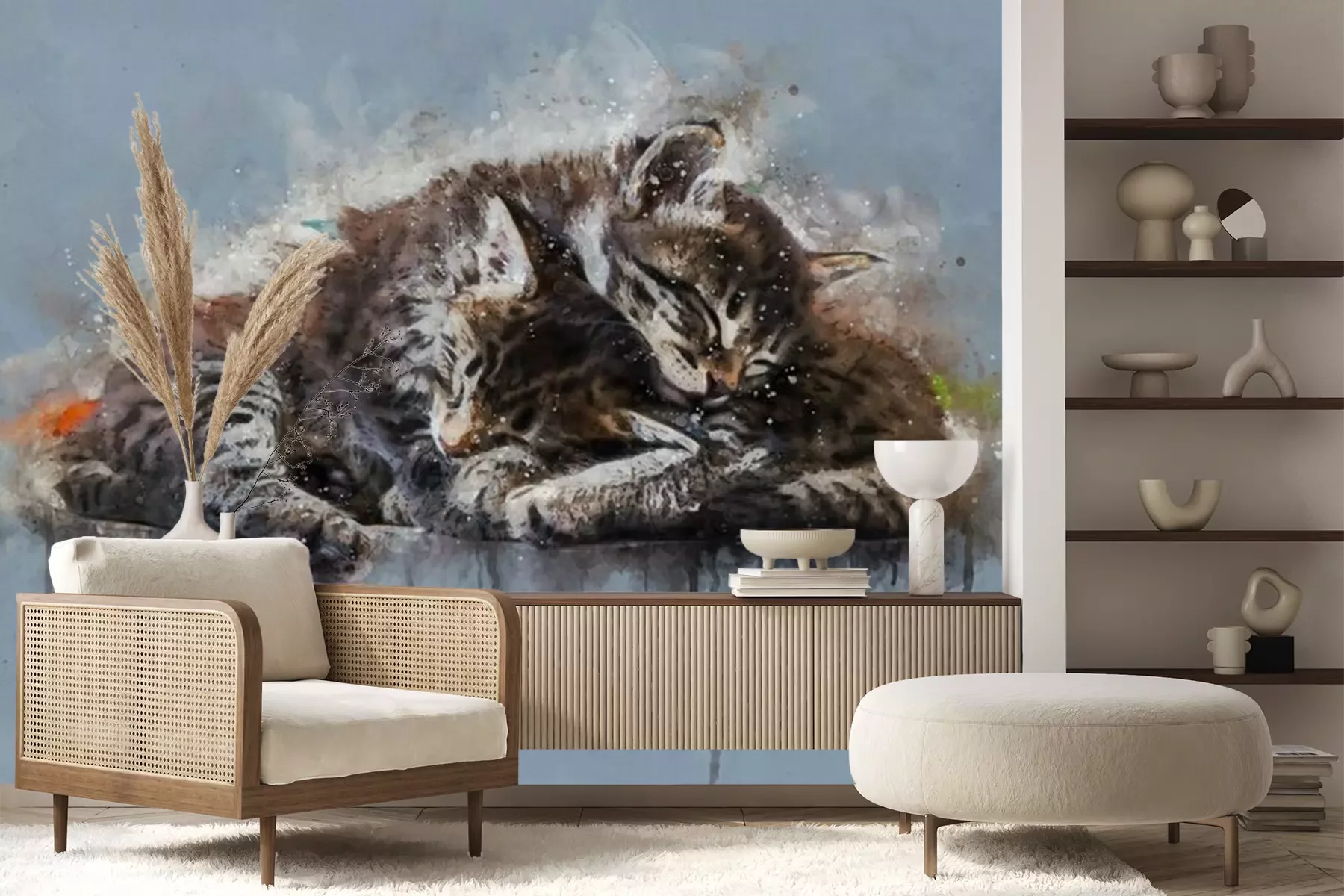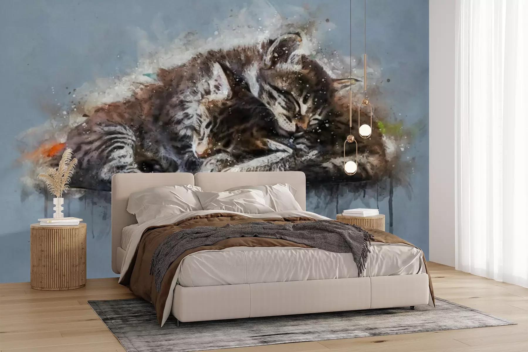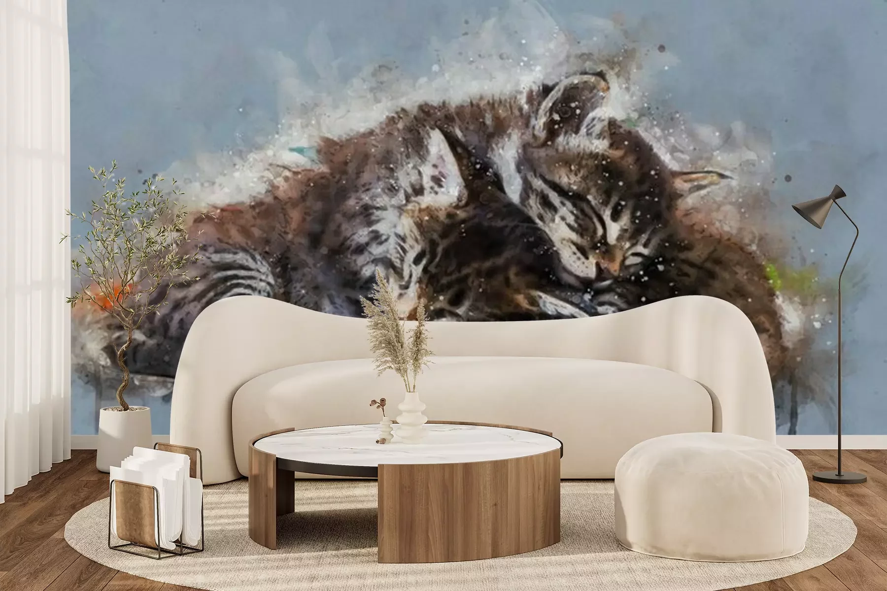 Fotobehang Watercolor illustration, Two little tabby cats sleeping together