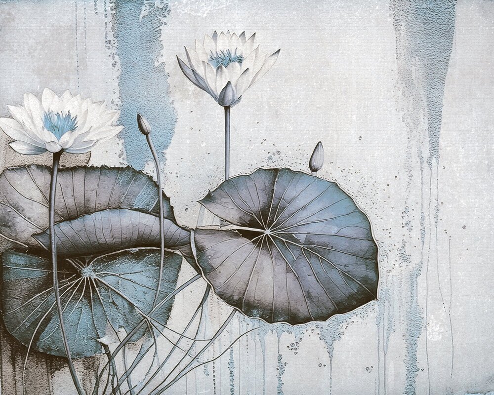 Fotobehang: Waterlelies en bladeren op een betonnen achtergrond