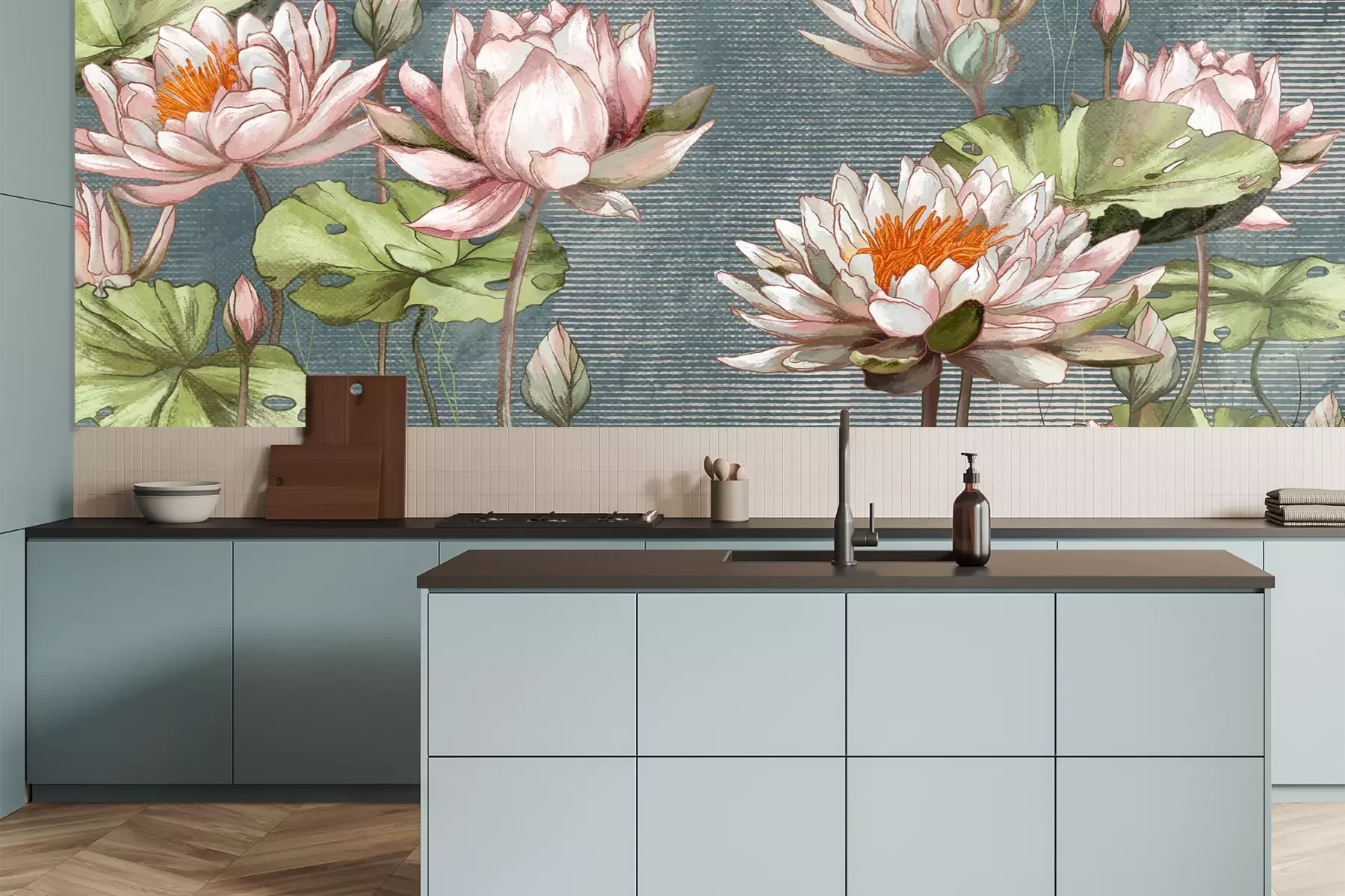 Het materiaal Premium is een glad vinyl op vlies, dat bestand is tegen uitrekken en vervorming. Het is dampdoorlatend – de muren kunnen vrij ademen – waardoor het geschikt is voor gebruik in de keuken en badkamer. Bij vervuiling kan het materiaal worden afgenomen met een vochtige doek. De maximale breedte van één baan bedraagt 95 of 105 cm, afhankelijk van de beschikbaarheid. Montage vindt plaats met de rand-aan-rand methode, wat een esthetisch resultaat zonder zichtbare naden oplevert. Omdat de lijm rechtstreeks op de muur wordt aangebracht, verloopt de installatie van het fotobehang snel en eenvoudig.