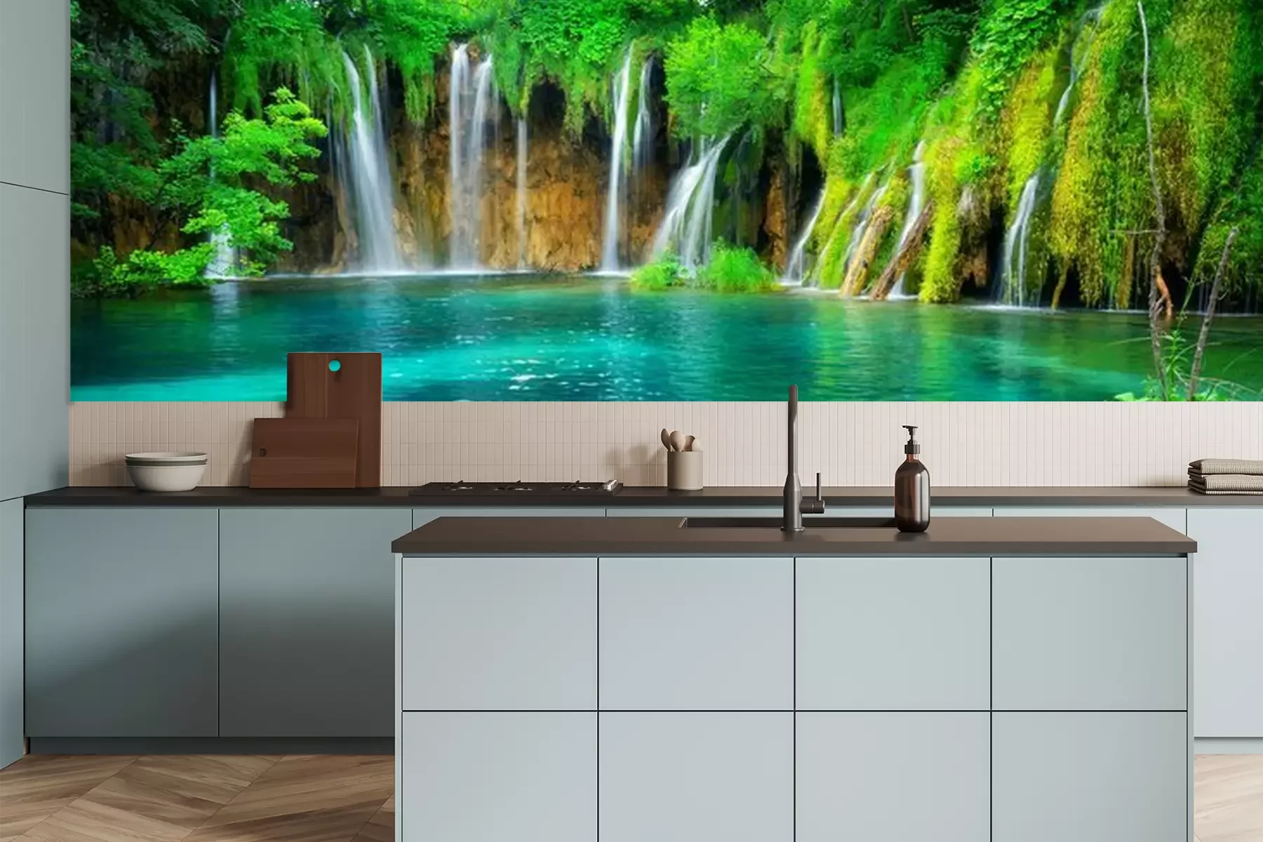 Het materiaal Premium is een glad vinyl op vlies, dat bestand is tegen uitrekken en vervorming. Het is dampdoorlatend – de muren kunnen vrij ademen – waardoor het geschikt is voor gebruik in de keuken en badkamer. Bij vervuiling kan het materiaal worden afgenomen met een vochtige doek. De maximale breedte van één baan bedraagt 95 of 105 cm, afhankelijk van de beschikbaarheid. Montage vindt plaats met de rand-aan-rand methode, wat een esthetisch resultaat zonder zichtbare naden oplevert. Omdat de lijm rechtstreeks op de muur wordt aangebracht, verloopt de installatie van het fotobehang snel en eenvoudig.