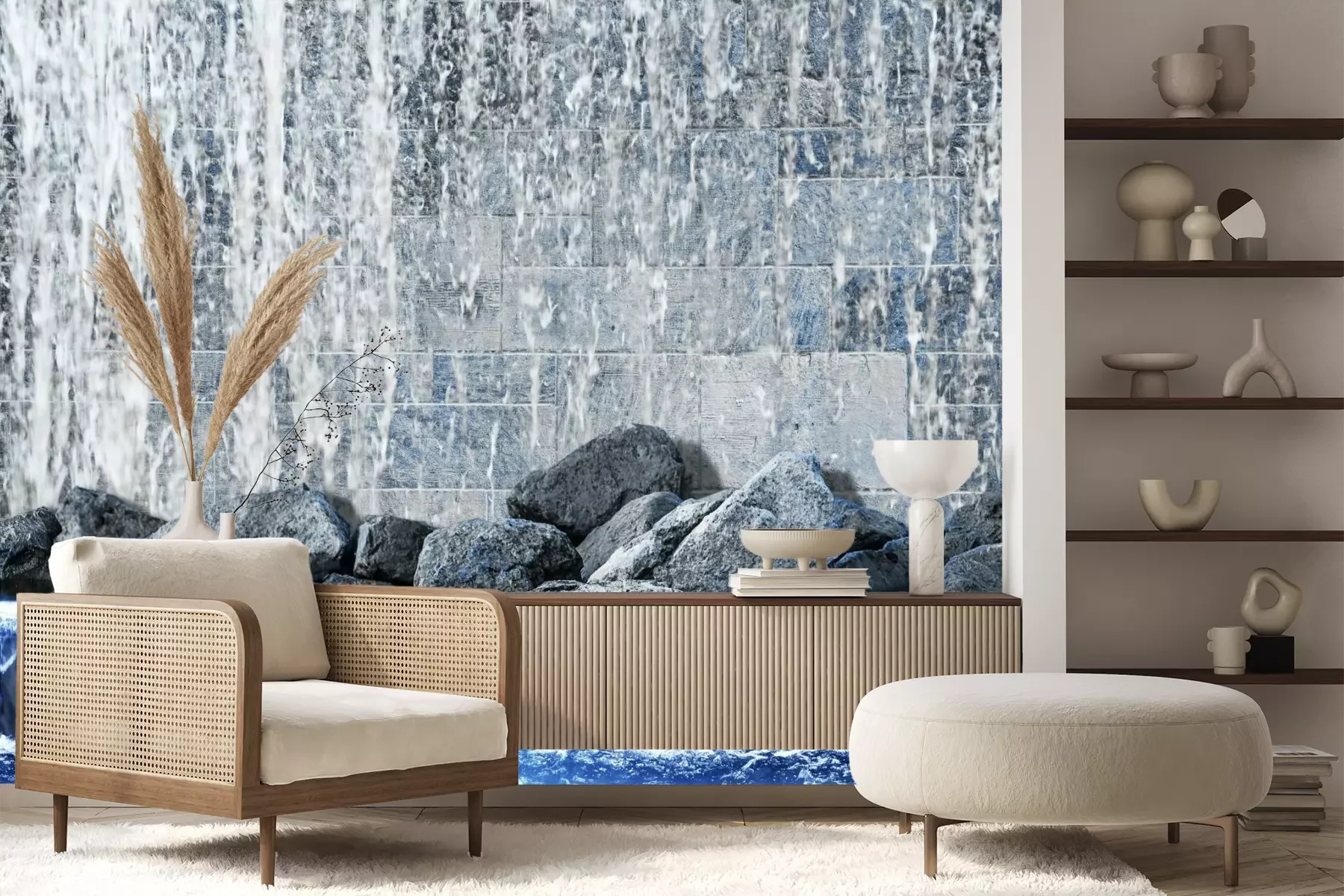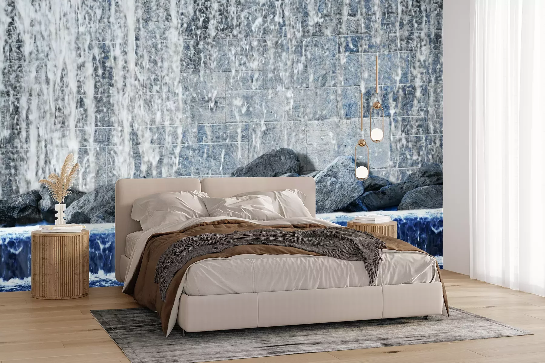 Het materiaal Premium+ is een gestructureerd vinyl op vlies met een gewicht van 255 g/m², dat kleine oneffenheden in de muur effectief camoufleert. De subtiele structuur van fijn zand geeft het oppervlak een exclusieve uitstraling, terwijl de halfmatte afwerking de diepte van de kleuren benadrukt. Het materiaal is dampdoorlatend, waardoor het ook in de keuken en badkamer kan worden gebruikt. De maximale breedte van één baan bedraagt 100 cm – bij grotere afmetingen wordt het fotobehang in meerdere gelijke banen verdeeld. De lijm wordt direct op de muur aangebracht en het behang wordt rand-aan-rand geplakt, wat zorgt voor een esthetisch resultaat zonder zichtbare naden. Het oppervlak kan gemakkelijk worden schoongemaakt door het voorzichtig af te nemen met een vochtige doek.