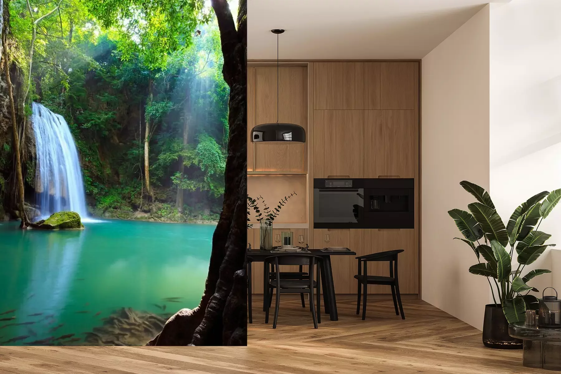 Het materiaal Premium+ is een gestructureerd vinyl op vlies met een gewicht van 255 g/m², dat kleine oneffenheden in de muur effectief camoufleert. De subtiele structuur van fijn zand geeft het oppervlak een exclusieve uitstraling, terwijl de halfmatte afwerking de diepte van de kleuren benadrukt. Het materiaal is dampdoorlatend, waardoor het ook in de keuken en badkamer kan worden gebruikt. De maximale breedte van één baan bedraagt 100 cm – bij grotere afmetingen wordt het fotobehang in meerdere gelijke banen verdeeld. De lijm wordt direct op de muur aangebracht en het behang wordt rand-aan-rand geplakt, wat zorgt voor een esthetisch resultaat zonder zichtbare naden. Het oppervlak kan gemakkelijk worden schoongemaakt door het voorzichtig af te nemen met een vochtige doek.
