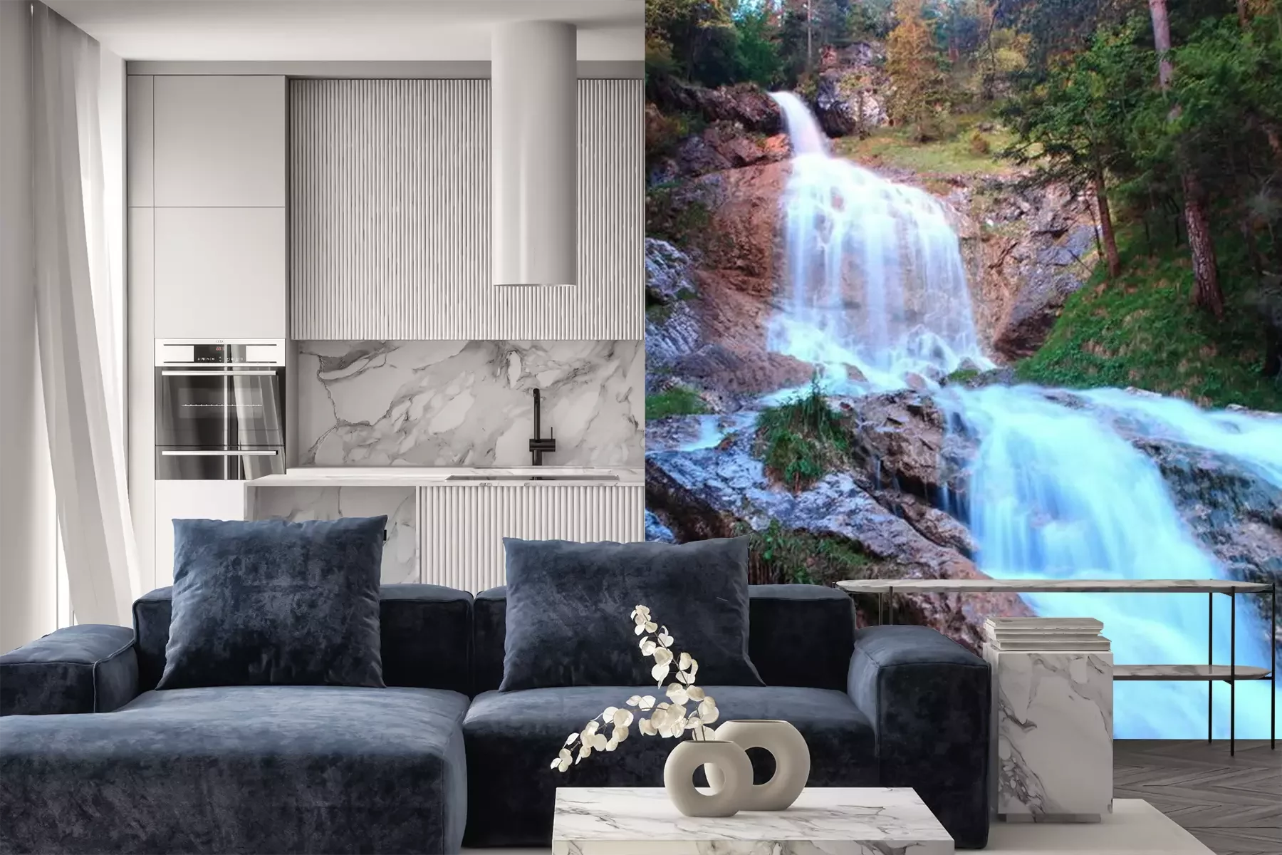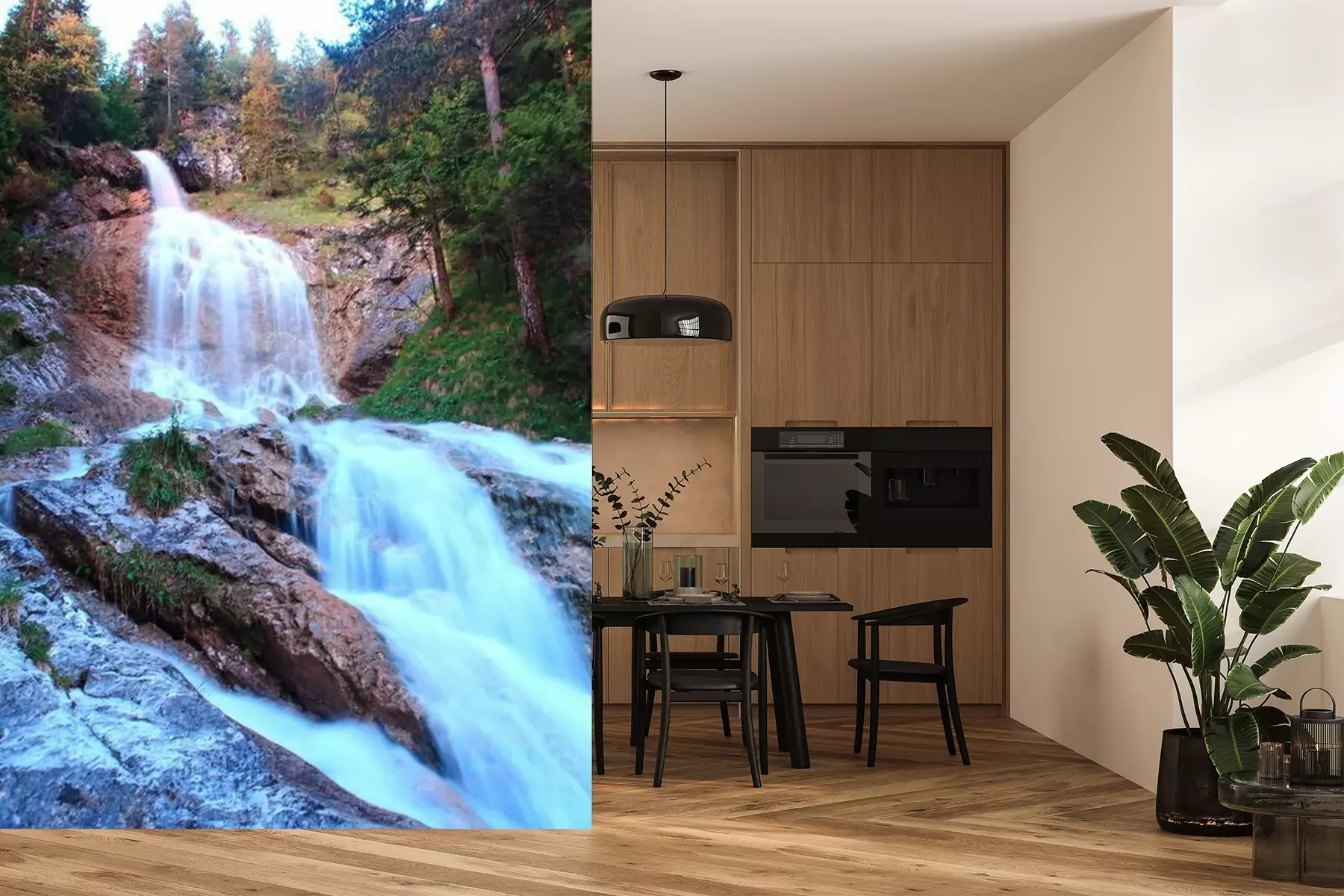 Het materiaal Premium+ is een gestructureerd vinyl op vlies met een gewicht van 255 g/m², dat kleine oneffenheden in de muur effectief camoufleert. De subtiele structuur van fijn zand geeft het oppervlak een exclusieve uitstraling, terwijl de halfmatte afwerking de diepte van de kleuren benadrukt. Het materiaal is dampdoorlatend, waardoor het ook in de keuken en badkamer kan worden gebruikt. De maximale breedte van één baan bedraagt 100 cm – bij grotere afmetingen wordt het fotobehang in meerdere gelijke banen verdeeld. De lijm wordt direct op de muur aangebracht en het behang wordt rand-aan-rand geplakt, wat zorgt voor een esthetisch resultaat zonder zichtbare naden. Het oppervlak kan gemakkelijk worden schoongemaakt door het voorzichtig af te nemen met een vochtige doek.