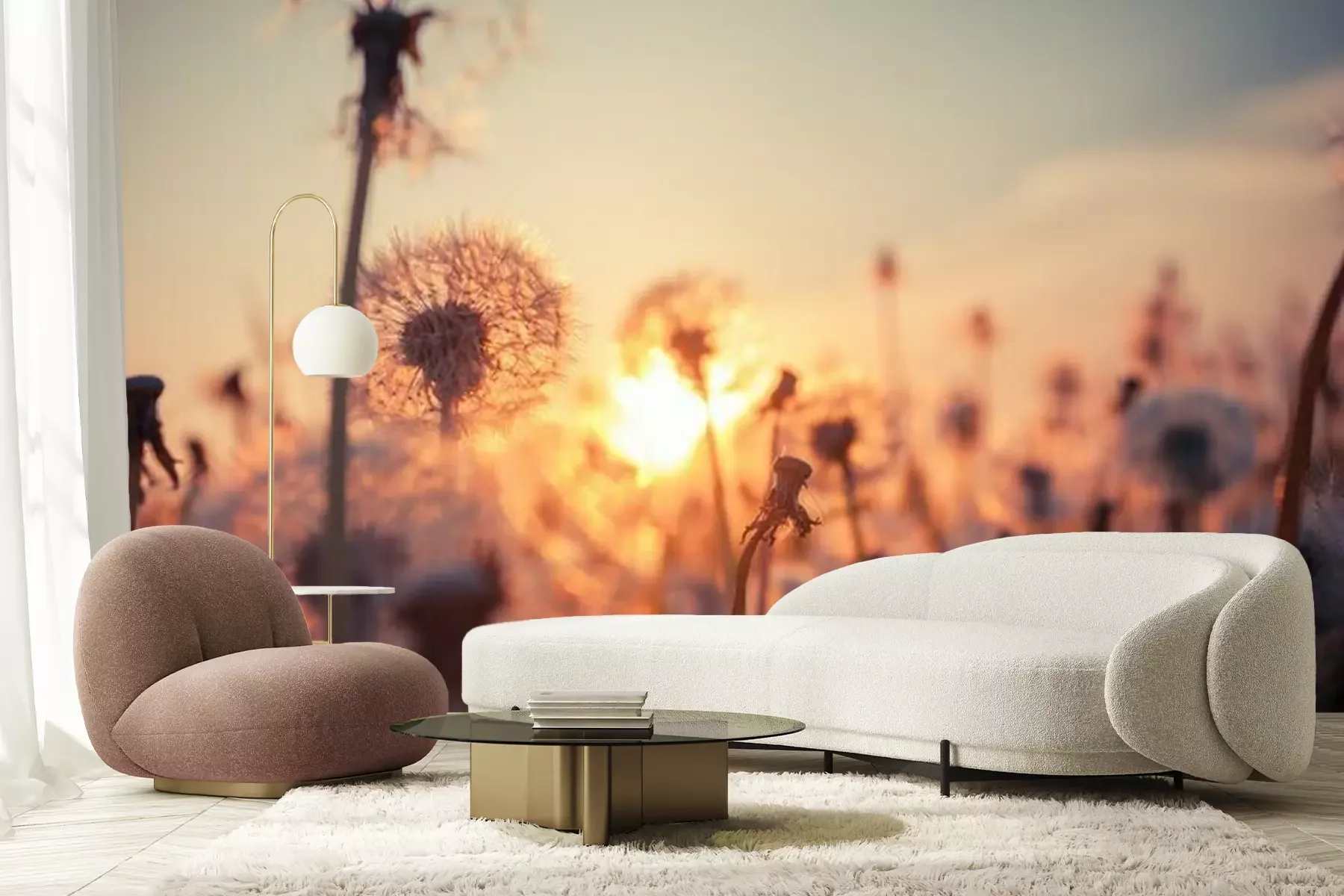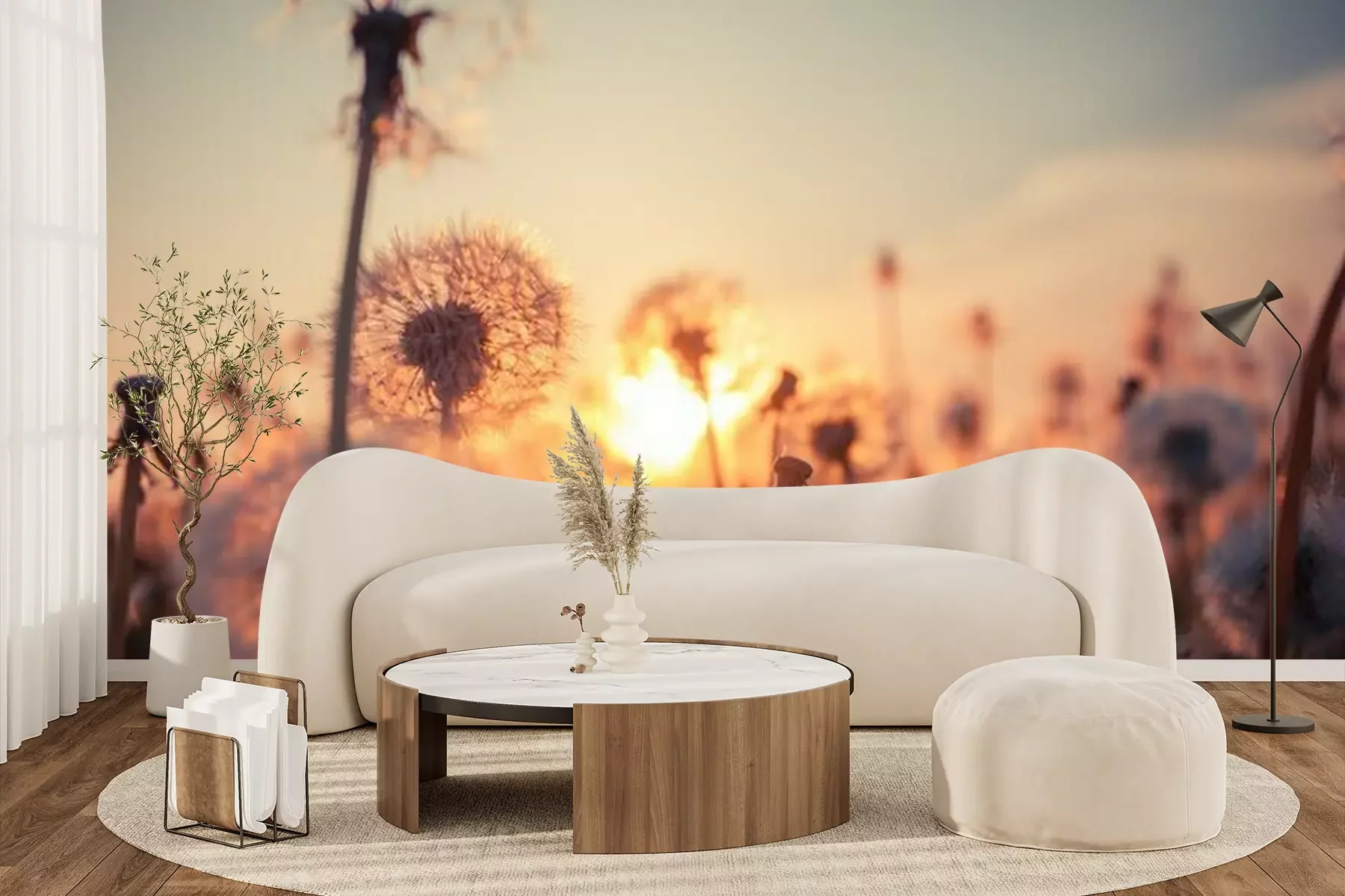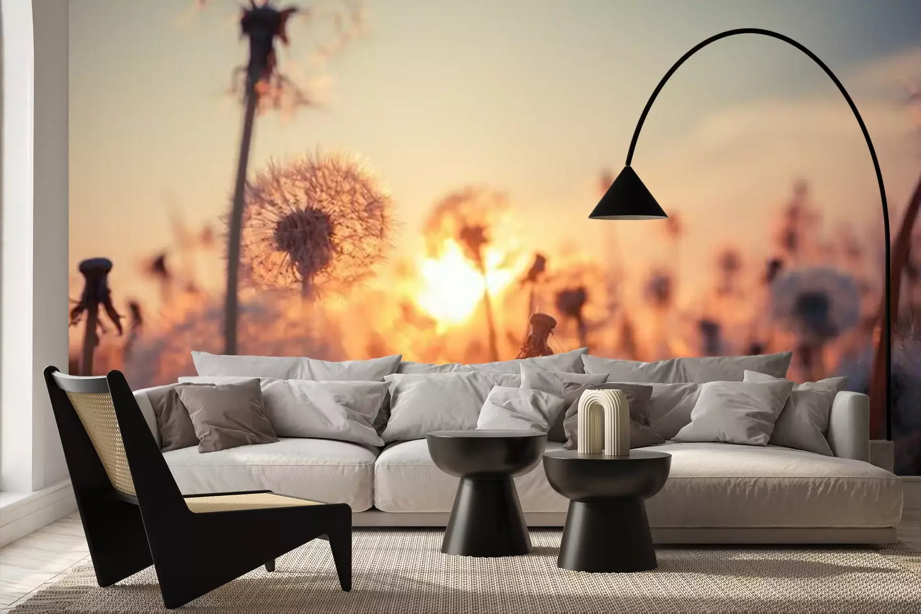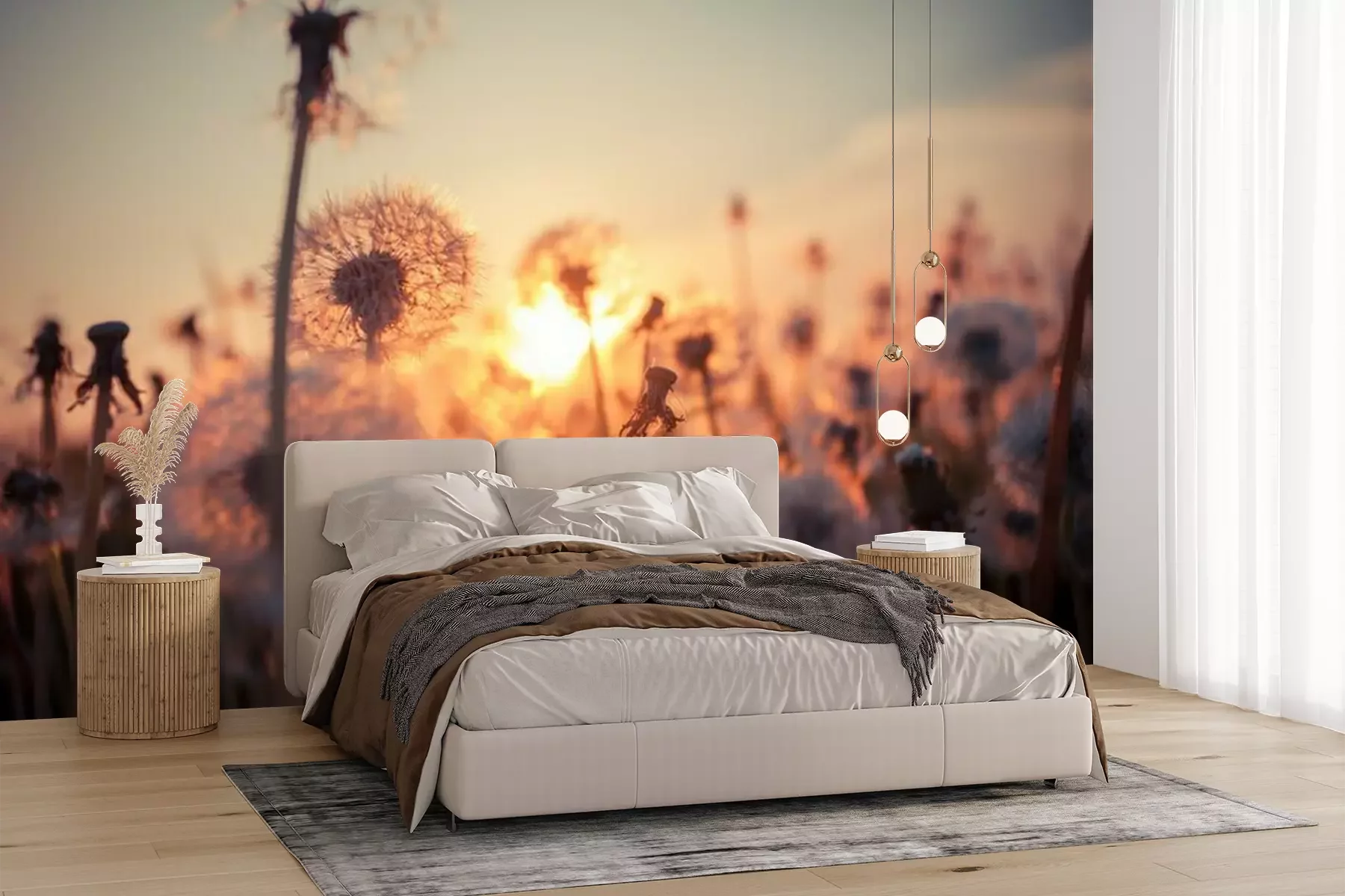 Fotobehang Weide van paardenbloemen bij zonsondergang