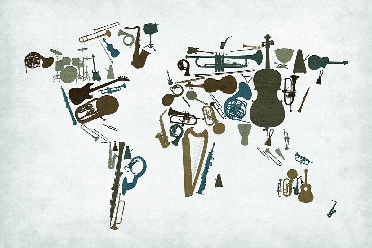 Fotobehang: Wereldkaart met instrumenten artistiek motief