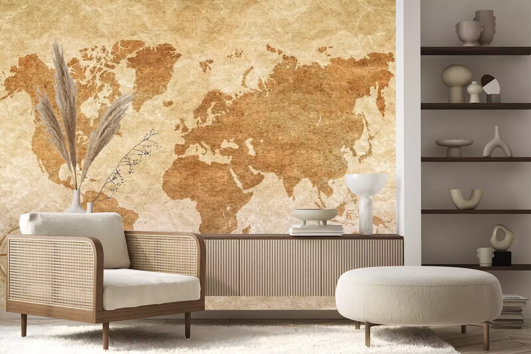 Het materiaal Premium+ is een gestructureerd vinyl op vlies met een gewicht van 255 g/m², dat kleine oneffenheden in de muur effectief camoufleert. De subtiele structuur van fijn zand geeft het oppervlak een exclusieve uitstraling, terwijl de halfmatte afwerking de diepte van de kleuren benadrukt. Het materiaal is dampdoorlatend, waardoor het ook in de keuken en badkamer kan worden gebruikt. De maximale breedte van één baan bedraagt 100 cm – bij grotere afmetingen wordt het fotobehang in meerdere gelijke banen verdeeld. De lijm wordt direct op de muur aangebracht en het behang wordt rand-aan-rand geplakt, wat zorgt voor een esthetisch resultaat zonder zichtbare naden. Het oppervlak kan gemakkelijk worden schoongemaakt door het voorzichtig af te nemen met een vochtige doek.